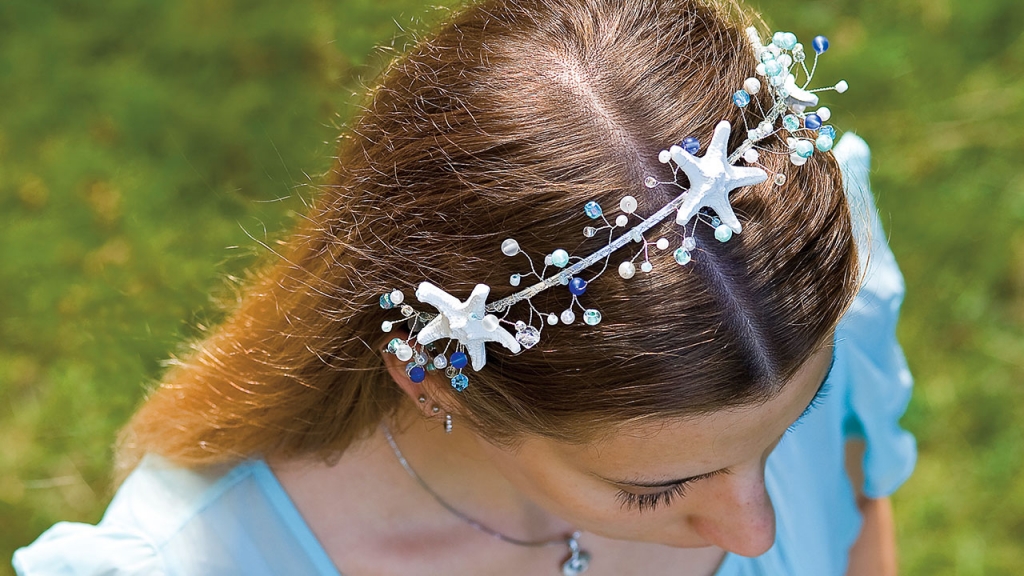 - Fektesd a füzért a hajpántra és egy drótszállal körbetekerve erősítsd rá. A drótvégeket többször csavard meg. Melegragasztóval erősítsd a gyöngyök közé a tengericsillagokat.