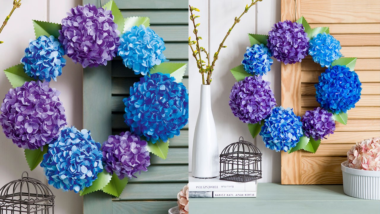 Látványos hortenziakoszorú selyempapírból: csodaszép dekoráció az ajtóra!