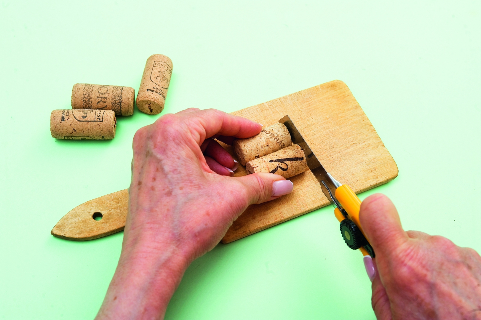 - A mi tálcánk pereme 3 cm magas, ezért a dugóknak ennél magasabbaknak kell lenniük. A legtöbb palackot 3,8 mm magas dugóval zárják, de lehetnek eltérések. Sniccerrel vágd egyforma méretűre mindegyiket: válassz ki egy megfelelőt, és a vágódeszkán fogd mellé egyenként a többit, úgy vágd le róluk a felesleget. A használt dugóknak érdemes a palack nyitása kor megsérült végükből vágni.