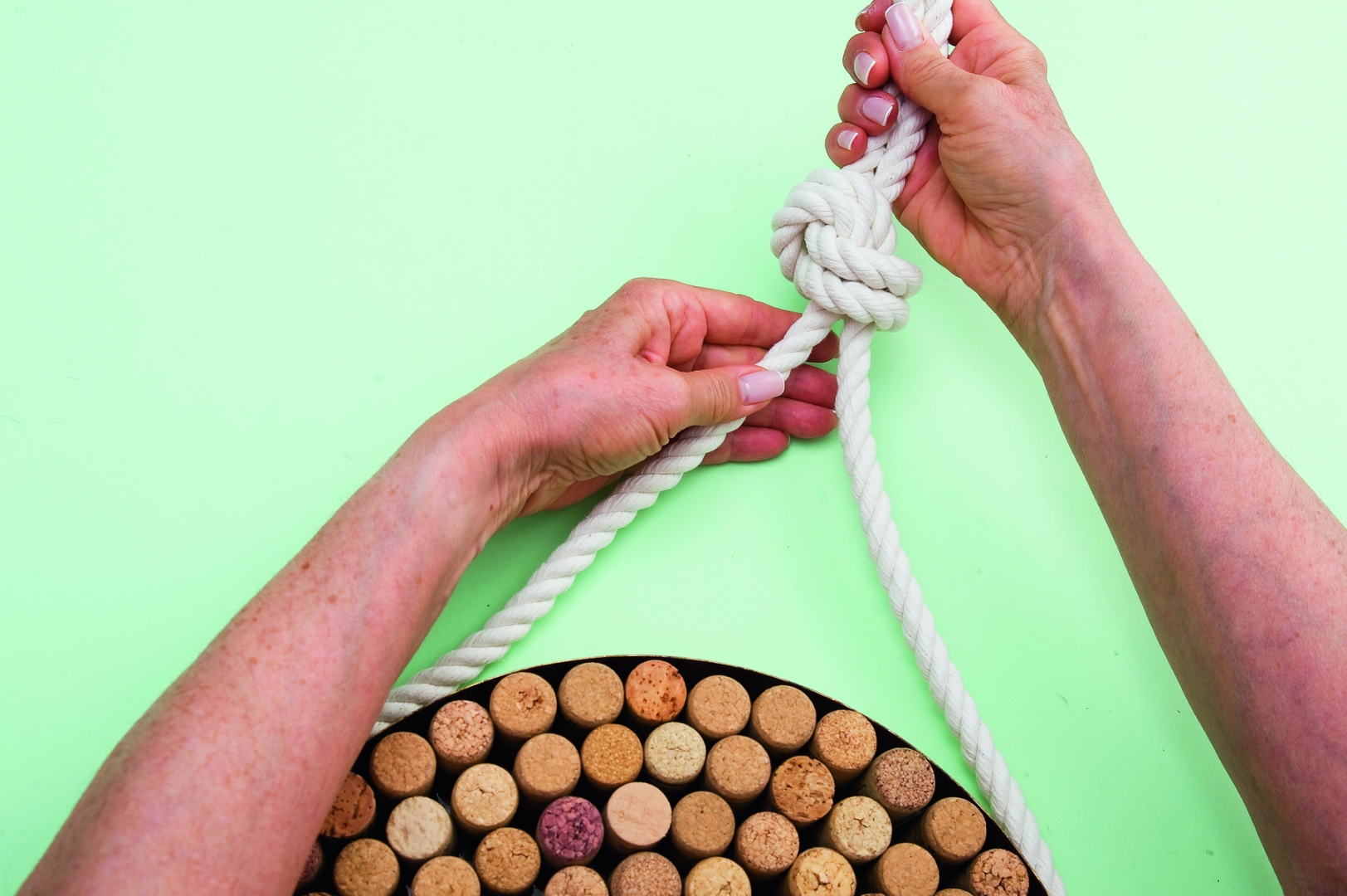 - Jelöld meg a tálca peremét alul, középen. Illeszd ide a pamutkötél közepét. Kezdd el innen a peremhez rögzíteni melegragasztóval. Haladj 15-20 cm-es szakaszonként jobbra és balra, egészen a tálca vízszintes felezőjének magasságáig. Ezután fogd össze fent a zsinórvégeket, és egy csomóval kösd össze. A felesleget vágd le, de előtte a megfelelő helyen tekerd körbe a zsinórt fehér szigetelőszalaggal, és fölötte vágd el – a ragasztószalag megakadályozza a zsinór szétbomlását.