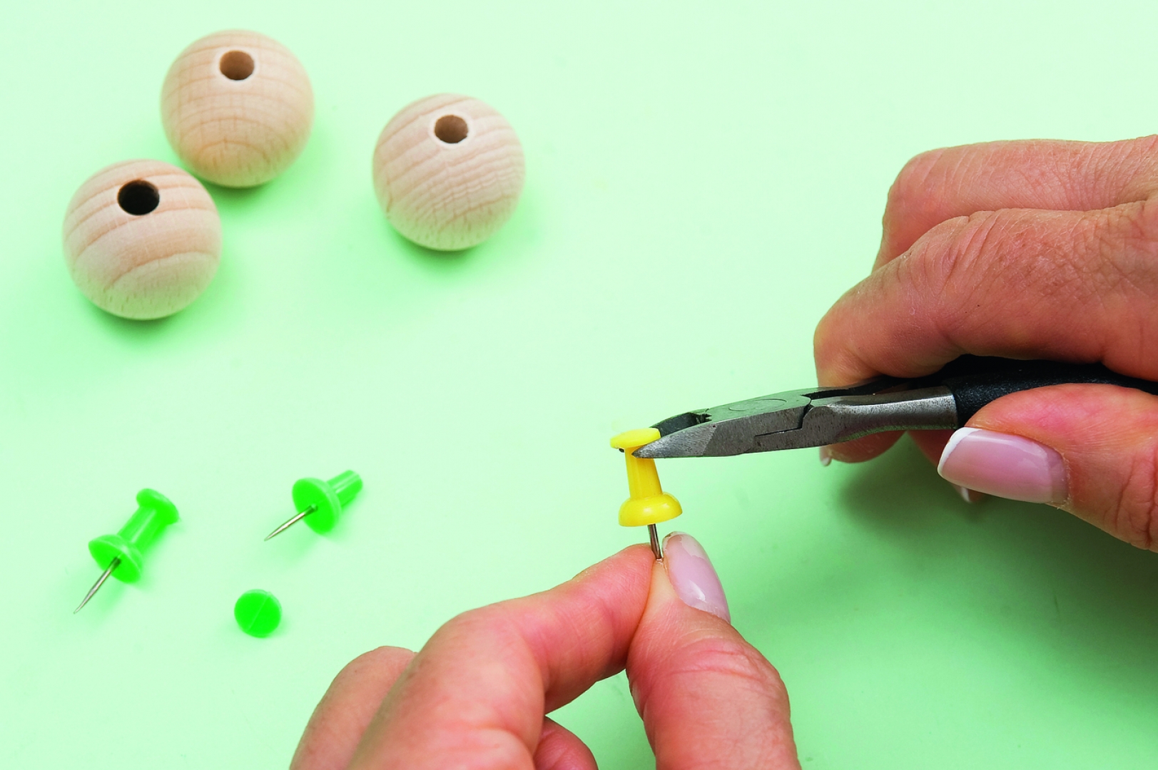 - A térképtűket dekorálhatod a fagolyókkal. Ehhez csípőfogóval csípd le a tűk műanyag végét, tegyél rájuk melegragasztót, és nyomd a golyók egyik lyukába.