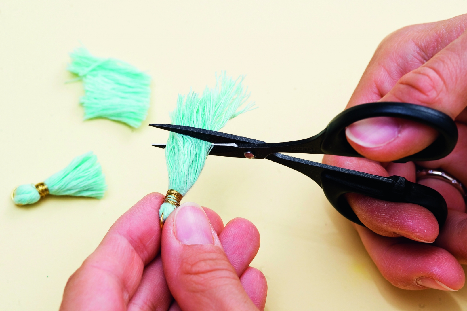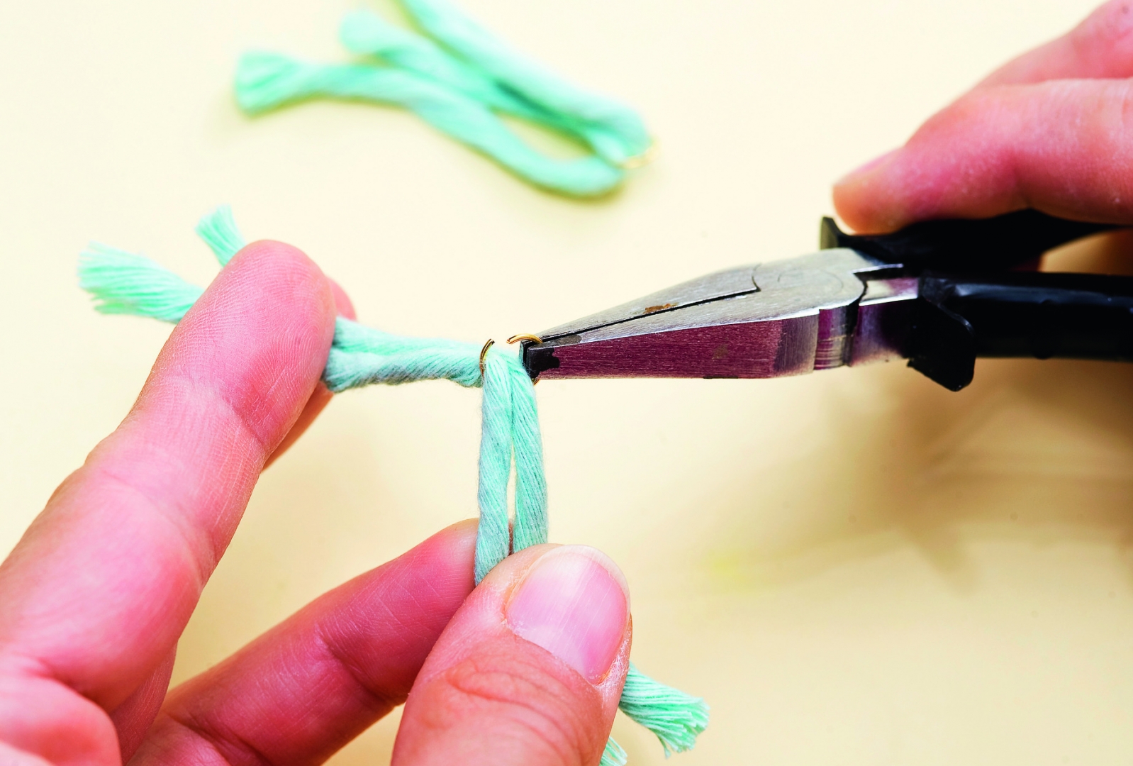 - Makraméfonalból készíts minibojtokat: a fonalból vágj le kb. 5 cm hosszú darabokat. Tetszés szerint 1-2 szálat fűzz át egy szerelőkarikán, majd hajtsd félbe őket. Ha a szerelőkarika végei nem illeszkednek pontosan, laposfogóval nyomd össze őket. Aranyszínű dróttal tekerd körbe néhányszor a fonaldarabokat a képen látható módon, majd az így kapott bojtot sűrű fogú fésűvel vagy rajzszeggel fésülgesd, hogy szétváljanak a szálak. Ezután ollóval vágd a kívánt méretűre a bojtot.