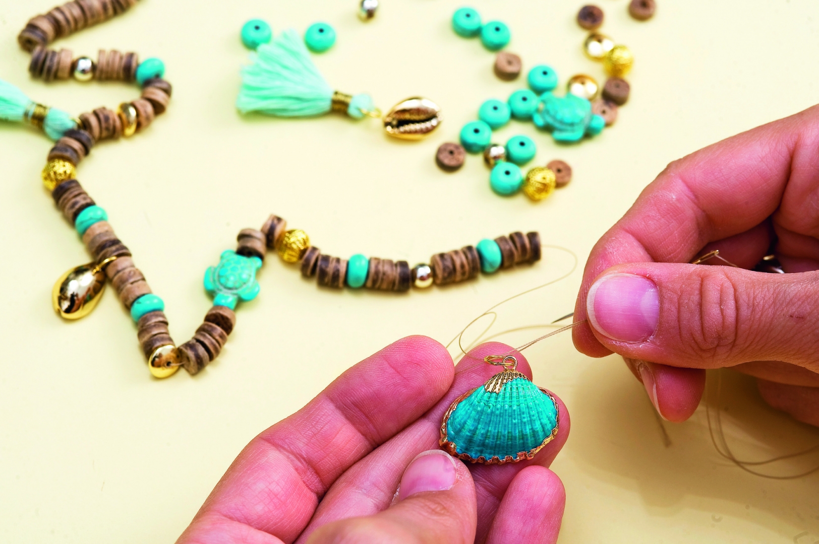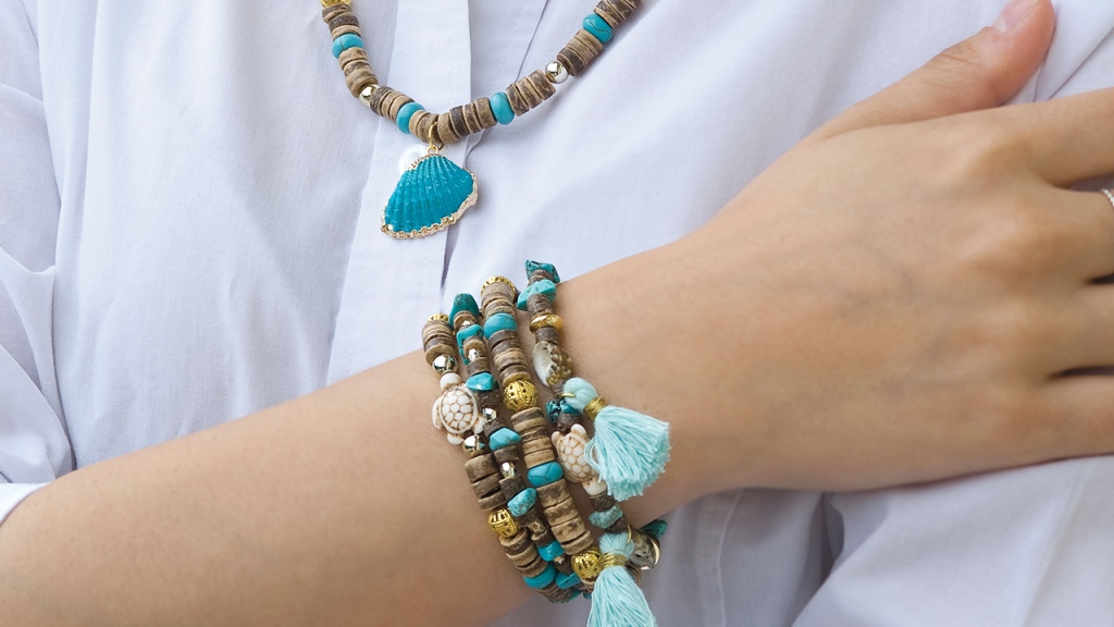 - A karkötő elemeit tedd ki magad elé az asztalra, és tervezd meg, milyen elrendezés tetszene. Fűzd fel a gyöngyöket, teknősöket, kagylókat, hematit korongokat, splittereket és bojtokat egy akkora darab gumis damilra, amely kényelmesen körbeéri a csuklódat. Így nem kell majd csatot használnod. Kösd össze a damil két végét, és szorosan csomózd is meg. Rejtsd el a csomót az egyik nagyobb lyukkal rendelkező gyöngy belsejébe.