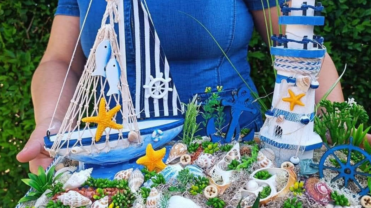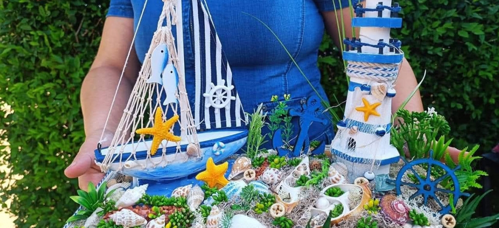 „Az idei legkedvesebb alkotásomat látjátok. Tudni kell munkáimról, hogy számomra nagyon fontos az egyediség és a minőség. Szinte minden alkotásomba kerülnek olyan különleges elemek, melyeket hazai alkotók készítenek részemre. Ennél a dísznél egy nagyon különleges kézműves, LED-es világítótornyot építettem be és kerestem hozzáillő kiegészítőket. A nagyméretű csónak-tál ugyancsak egy hazai kisvállalkozás terméke. Gyönyörű összhangot adott ennek a dekorációnak az igazi tengerészkék szín, mely végig visszatért a kiegészítőkben. Igyekeztem az apró részletekben is visszaadni egy tengerpart szépségét. Remélem benneteket is elrepít egy mesevilágba!”