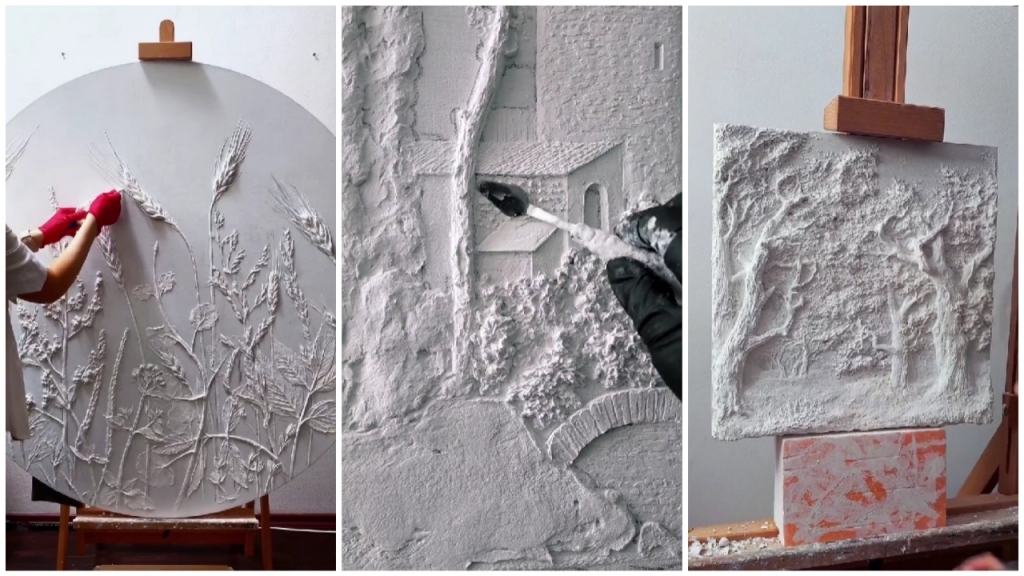 Alkotásaihoz sokszor a természet adja az ihletet, növényi motívumokkal dolgozik, és a videói alapján minden egyes forma gondos, kézi munkával készül – láthatod, ahogy a levelek vagy szirmok kibomlanak a falból.