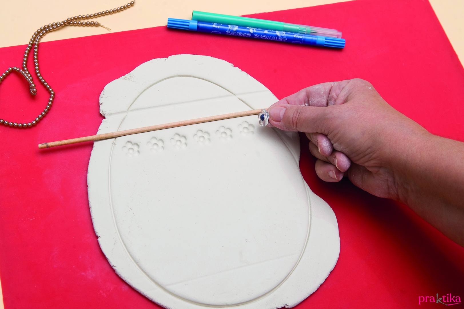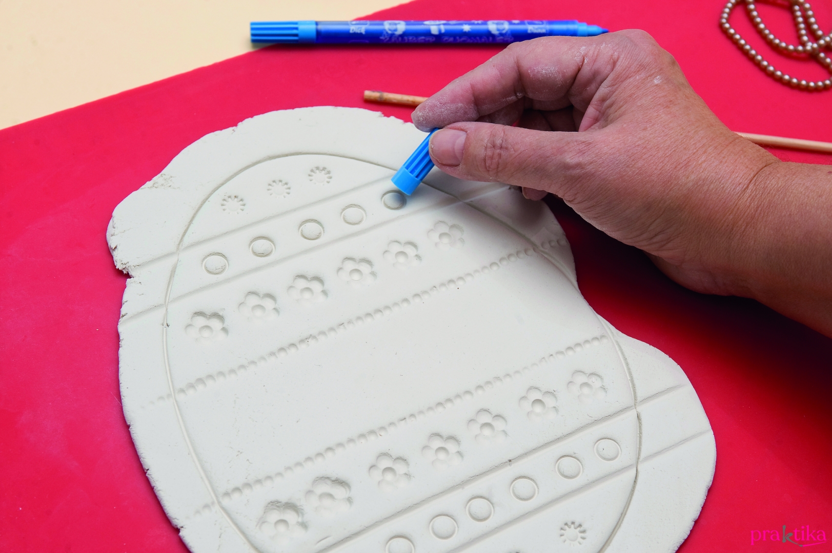 - A sablonívről másold ki indigó segítségével papírra a tojásmintát, és vágd ki pontosan a körvonalon. Nyújtsd ki a gyurmát 4-5 mm vastagra, fektesd rá a tojásmintát, és késsel karcold körbe.