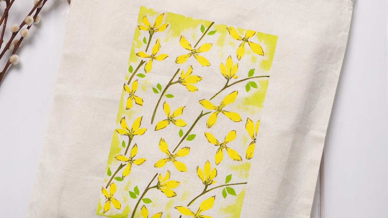 A napsárga aranyvesszőket sablonnal mintázhatod a vászontáskára. Utána a szirmoknak textilfilccel adhatsz egyedi karaktert. Ráadásként mi egy belső zsebet is varrtunk hozzá, amiben éppen elfér az összehajtott táska.