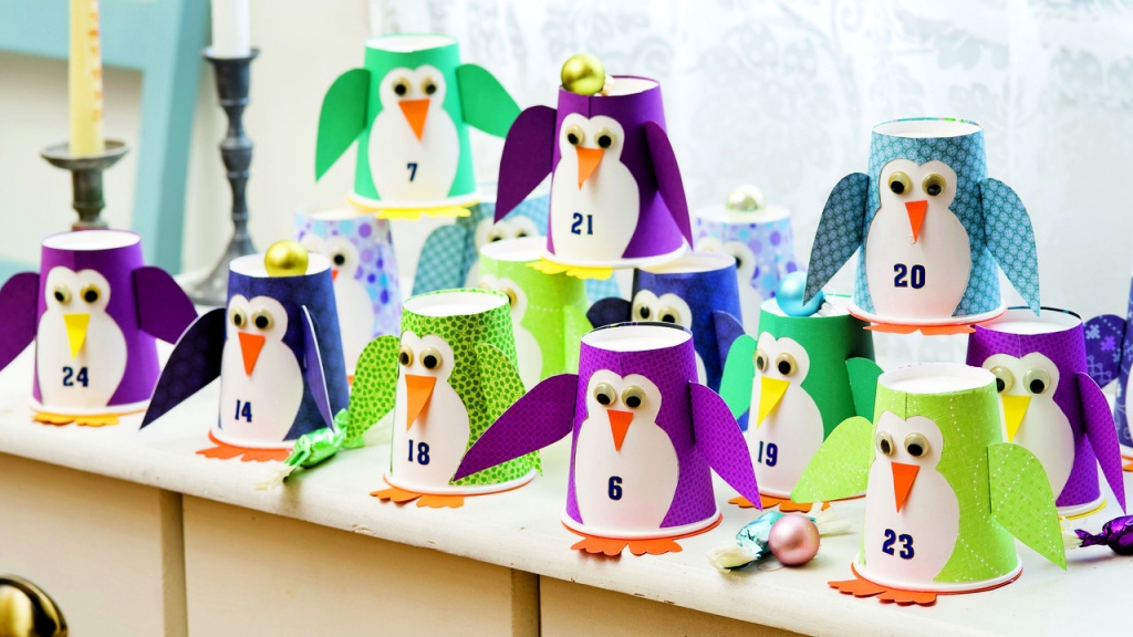 - Töltsd meg apró ajándékokkal, csokikkal, cukorkákkal a poharakat, majd ragaszd fel a peremükre a talpakat. Végül tedd fel a pingvinek hasára az öntapadós számokat.