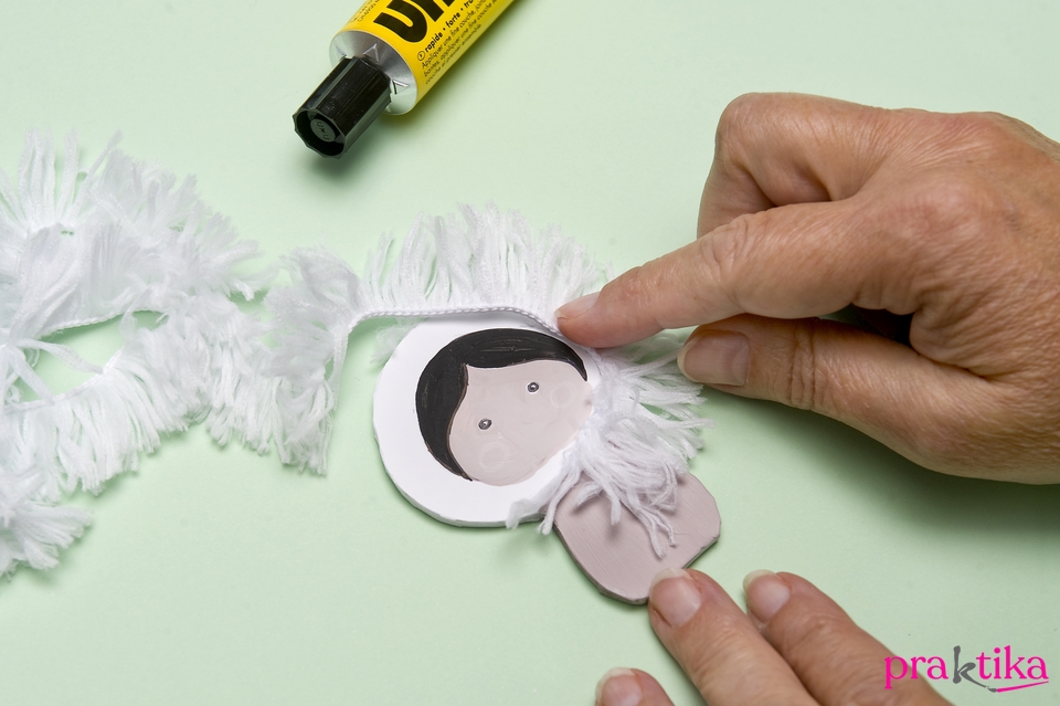 - A karokhoz gömbölyíts két pici vattagombócot. Kend be a testen a helyüket ragasztóval, majd nyomd oda a gombóckákat. Simogasd át felülről is őket, míg a félgömb forma kialakul. Hagyd száradni. Hasonlóképpen készíts két kis gombócot a fejre pofi gyanánt. Kissé nedvesítsd be az arcot, és az ujjaddal vagy egy gömbölyű végű tollvéggel nyomj két mélyedést a szemeknek a még nedves felületbe. A vattából gyúrj, pödörj egy kis répaorrot.