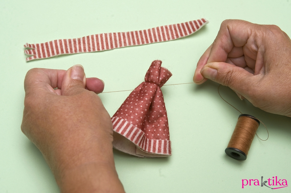 - A sálhoz vágj egy 1,5 cm széles, kb. 15 cm hosszú csíkot a csíkos filcből. A két végét vagdosd be. Mérd le a hóember fejkörfogatát. Vágj a pöttyös filcből egy akkora téglalapot, aminek a magassága 8 cm, a hosszú oldala pedig akkora, mint a hóember fejkör fogata. A csíkos filcből vágj egy ugyanolyan hosszú csíkot, ami 1,5 cm széles. Melegragasztóval ragaszd fel a pöttyös filc egyik hosszú oldalára. Hajtsd hengerré a téglalapot, és ragaszd össze a két rövid oldalt úgy, hogy kissé fedjék egymást. Felül kösd át cérnával, hogy kialakuljon a bojt. Tekerd a hóember nyaka köré a sálat, végül ragaszd fel a fejére a sapkát, a kezébe pedig a seprűt.