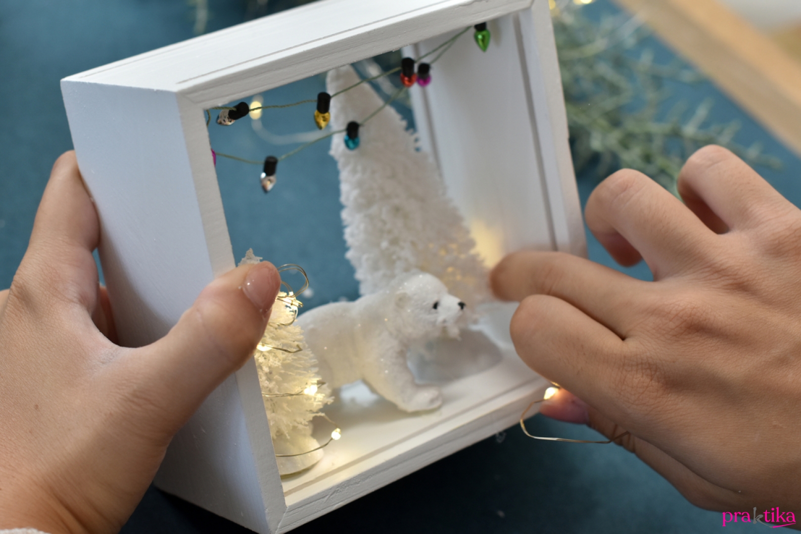 - Kis kétoldalú ragasztódarabkákkal rögzítsd a doboz alsó felébe a fenyőfákat két oldalra, a jegesmacit pedig középre. Tekerd körbe a fenyőfákat a LED- es égősorral. Tedd be a helyére a hátteret. A jegesmaci és a fenyőfák köré tetszés szerint szórhatsz műhavat. Végül tedd be a plexilapot a helyére.