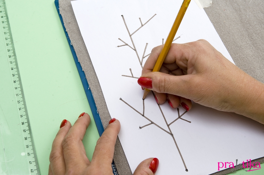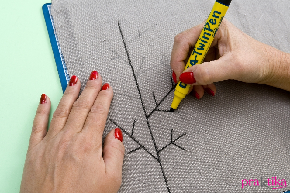 - A mintaívről indigóval másold ki papírra az ágmintát, majd golyóstollal szurkáld meg a vonalak kezdő- és végpontjait. Helyezd a papírt az egyik szürke textildarab bal oldalára, ügyelve arra, hogy a kész alátét 1-1 cm-rel kisebb lesz majd a varrásráhagyás miatt. Maszkolószalaggal vagy gombostűvel rögzítsd a sablont a textilre. A sablonon lévő lyukakon keresztül ceruzával jelöld át az anyagra a vonalak kezdeteit és végeit, majd a sablont felhajtva kösd össze a pontokat vonalzó segítségével. Érdemes áganként jelölni és össze kötni a pontokat, mert ha egyszerre csinálod az összeset, belezavarod hatsz a jelöléshalmazba. A bátrabbak szabad kézzel, sablon nélkül is felrajzolhatják ezt a nem túl bonyolult mintát, nem kötelező pont ugyanolyan hosszú és mennyiségű ágat rajzolni.