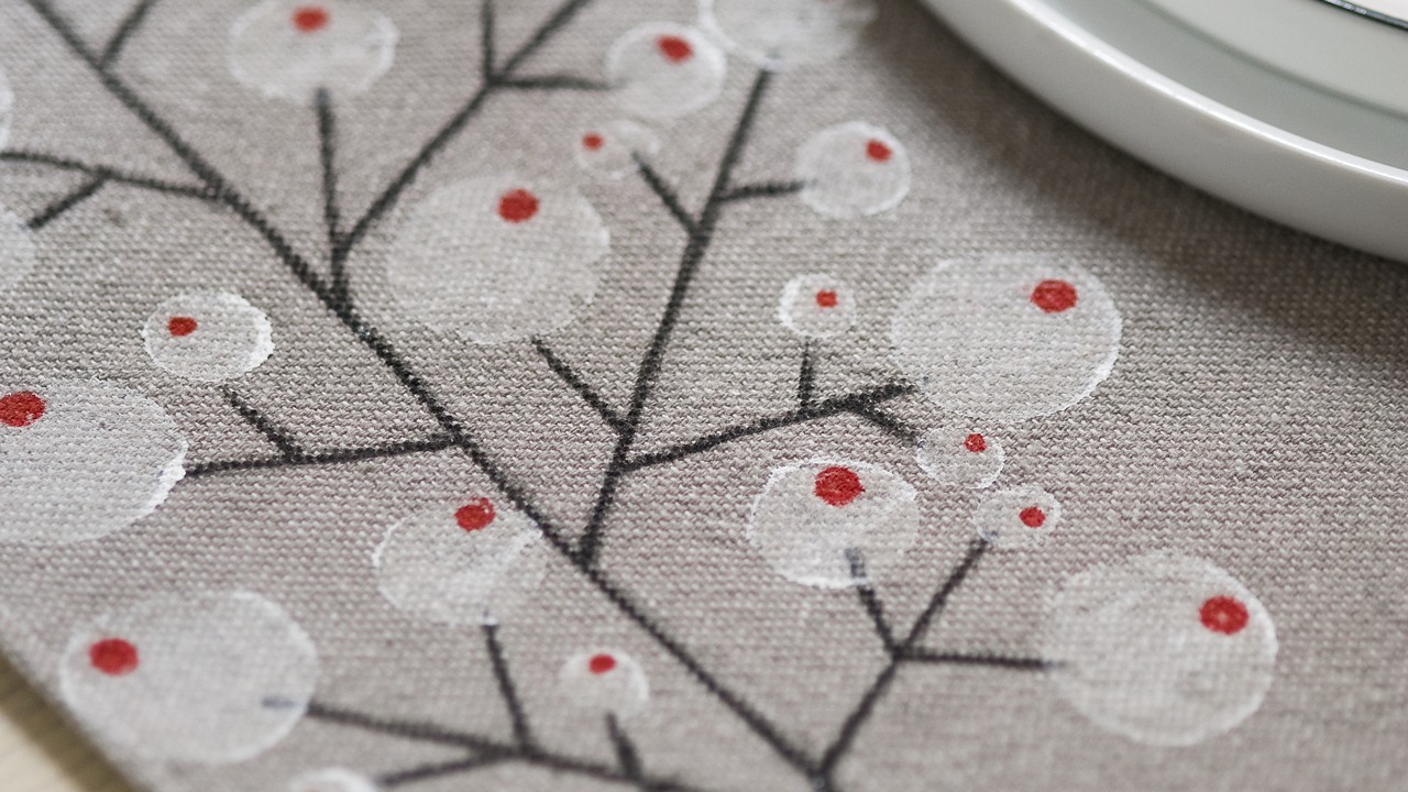 Nem ismerünk senkit, aki ne nyomdázott volna még burgonyával, de vajon hányan próbálták már ki a petrezselyemgyökérrel való alkotást? Kedvcsinálóként ezt a hóbogyós mintát ajánljuk, amely pompásan fest a szürke textil tányéralátéten, de reméljük, kedvet kapsz egyedi minták tervezéséhez is!