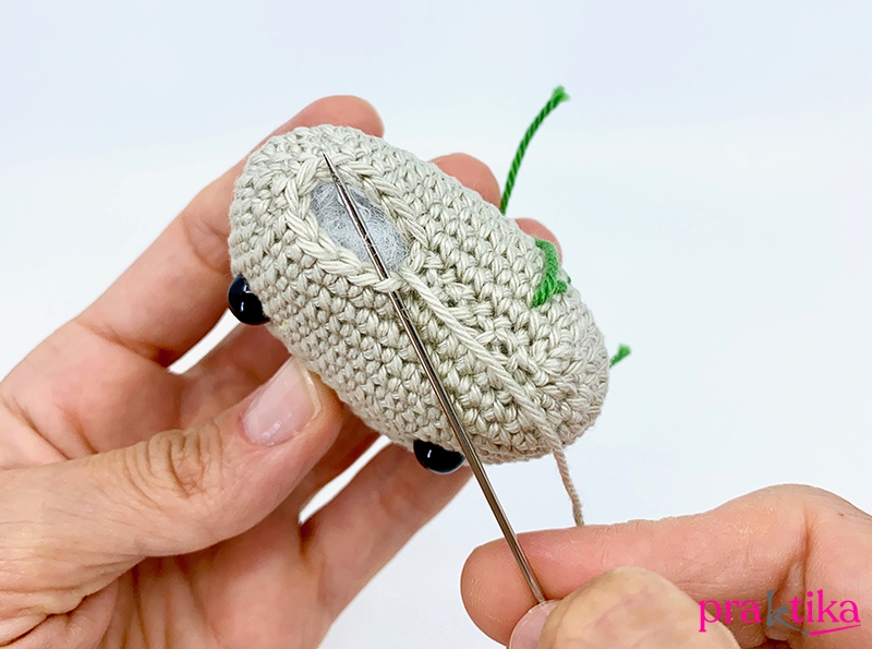 Rögzítsd az ut hurkot, hagyj hosszú szálat a varráshoz, majd tömd ki a testet. Varrd össze a lyukat úgy, hogy a pálcák eksz-ába öltesz csak.