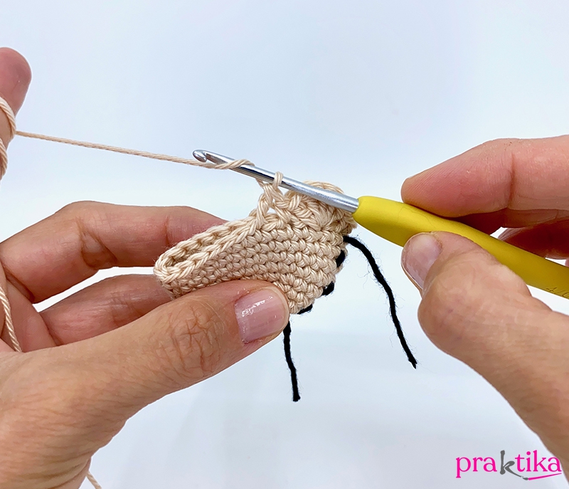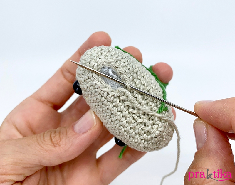 Helyezd a biztonsági szemet a 12. és 13. sorok közé, 9 szemet hagyva közöttük. Kezdd el kitömni a testet. 19. kör: 1 rp a köv 2 rp-ba, [LF] 3-szor, 1 rp a köv 11 rp-ba, [LF] 3-szor, 1 rp a köv 9 rp-ba. <28 rp>