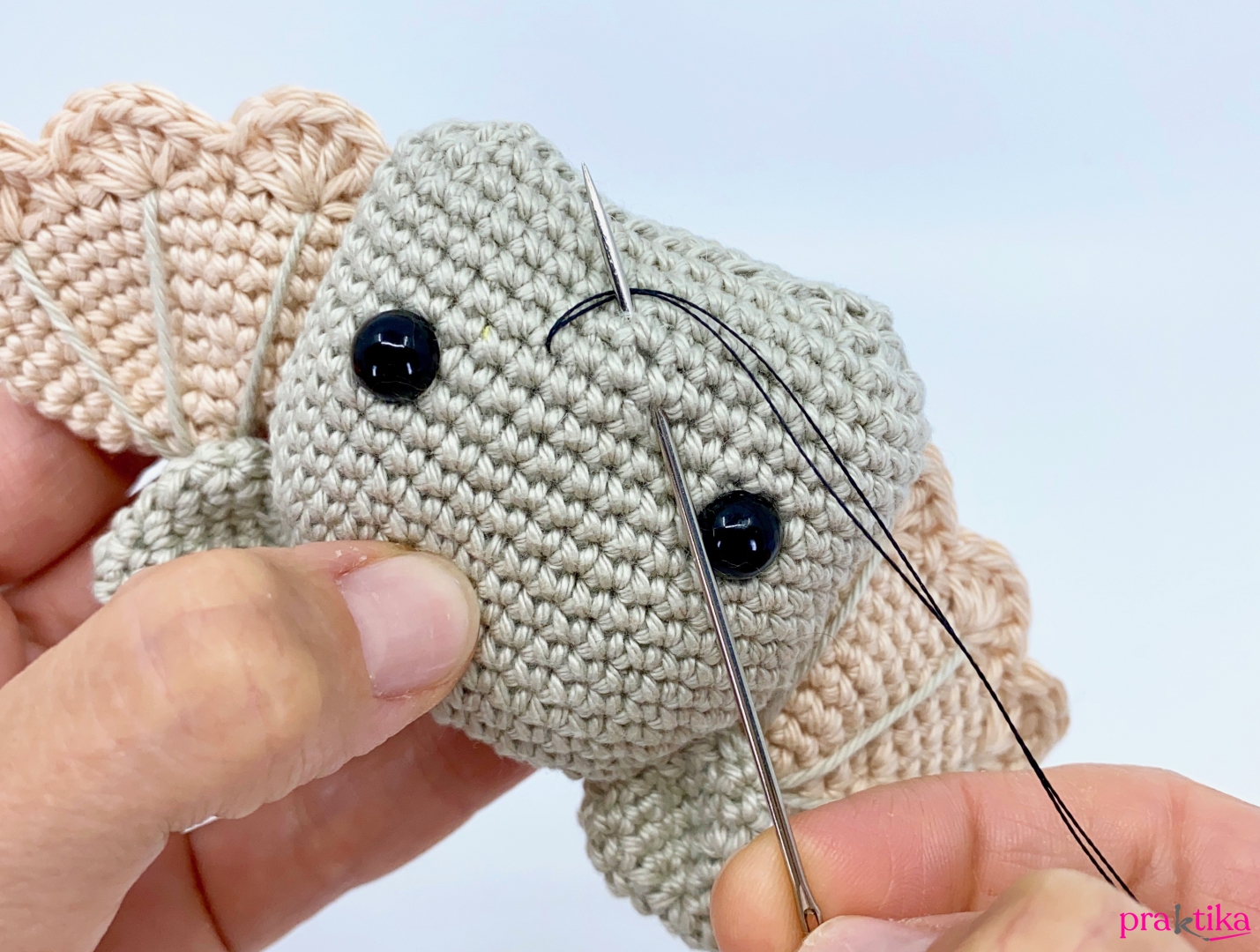 A fonallal, az állítható fonalgyűrűkből kiindulva hímezz három vonalat a kagyló minták közepébe. Varrd fel a szárnyakat a megfelelő oldalakra, a hát 6. és 15. körei közé. Fekete hímzőcérnával hímezz szájat a 14. és 17. sorok közé. Rózsaszín fonallal hímezz egy apró vonalat a 14. és 15. sorok közé arcpírnak, a szemek alól indulva a szárnyak felé.