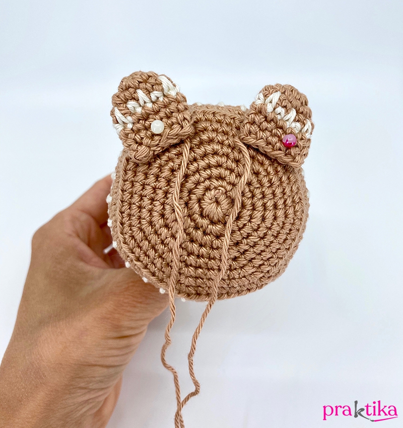 Tömd ki a fejet. Hagyj hosszú szálat, vágd el a fonalat, és rögzítsd az utolsó hurkot. Zárd a nyílást apró öltésekkel, majd sződd be a fonalat a fejbe