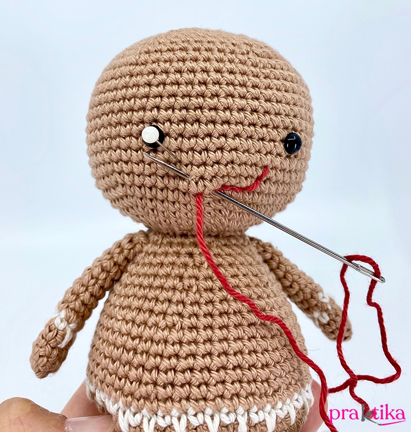 Piros hímzőcérnával hímezz széles szájat apró öltésekkel haladva pálcánként, a fej 5. és 8. körei közé.