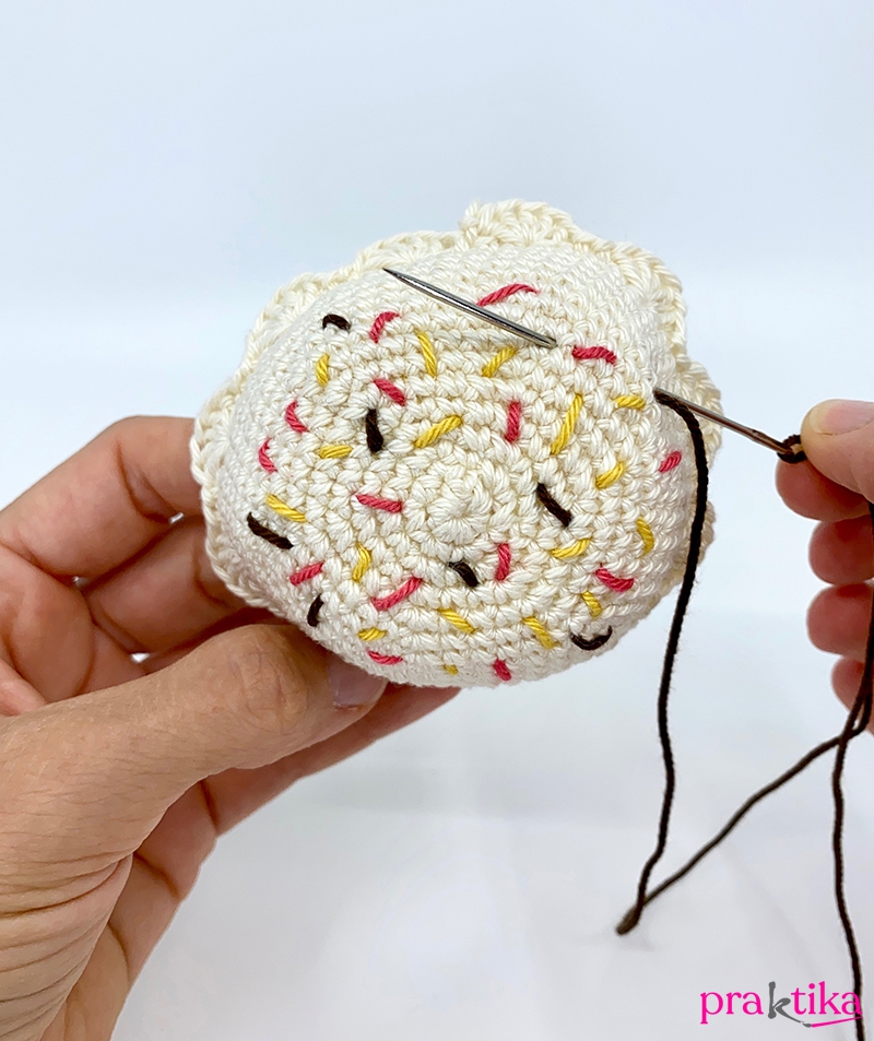 Rögzítsd az utolsó hurkot, hagyj hosszú szálat, majd vágd el a fonalat. Hímezz a különböző színű fonalakkal apró vonalkákat a tetejére cukorszórásként.