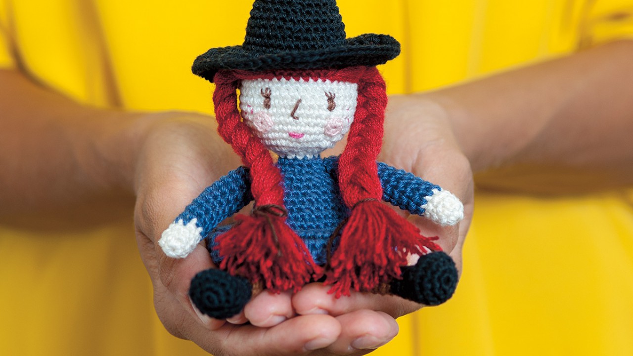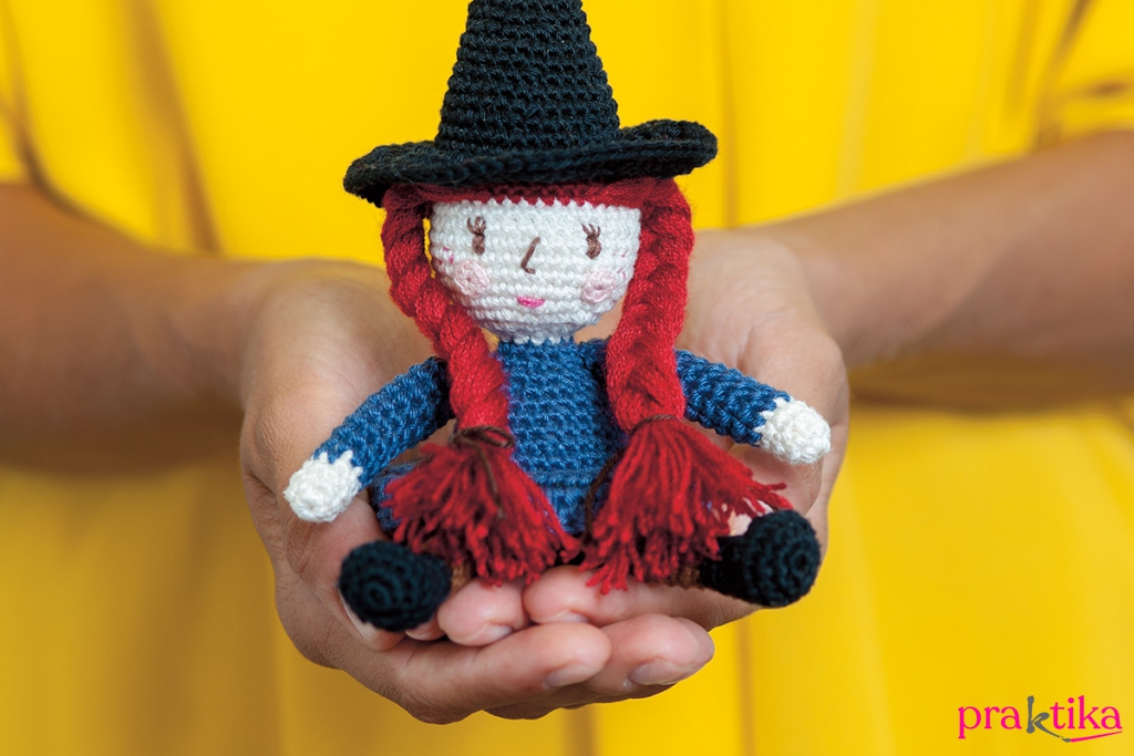 Hozzávalók • szürke, fekete és fehér Catania fonal • narancssárga Alize fonal a hajnak • kék és rózsaszín horgolócérna • 1,75-ös horgolótű • tömőanyag