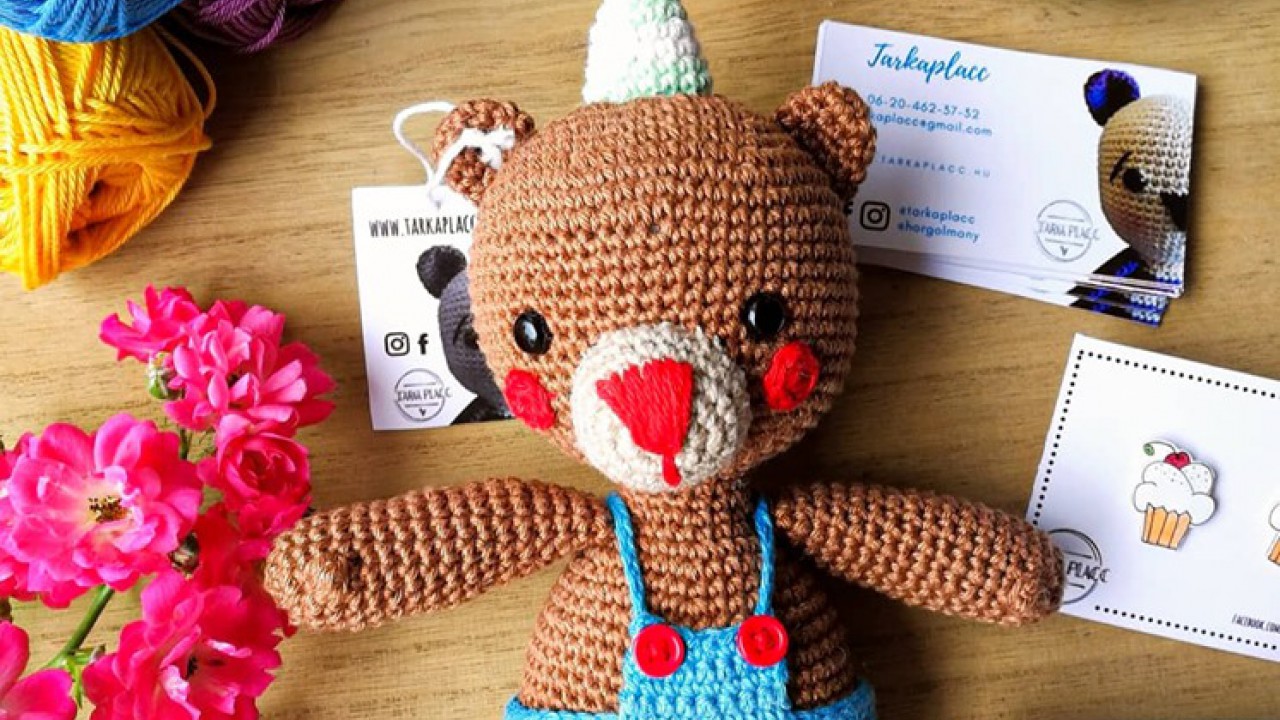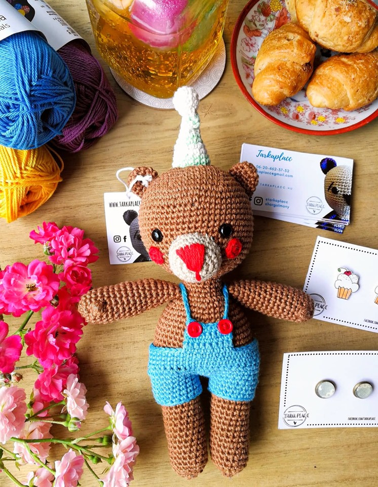 Hozzávalók: • Catania fonal: sötétbarna, piros, kék, bézs, menta, fehér • 2-es horgolótű • vatelin vagy más tömőanyag • 8 mm-es biztonsági szem • 2 db piros gomb