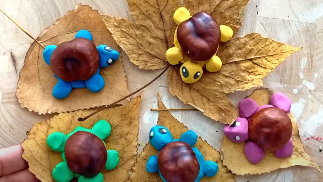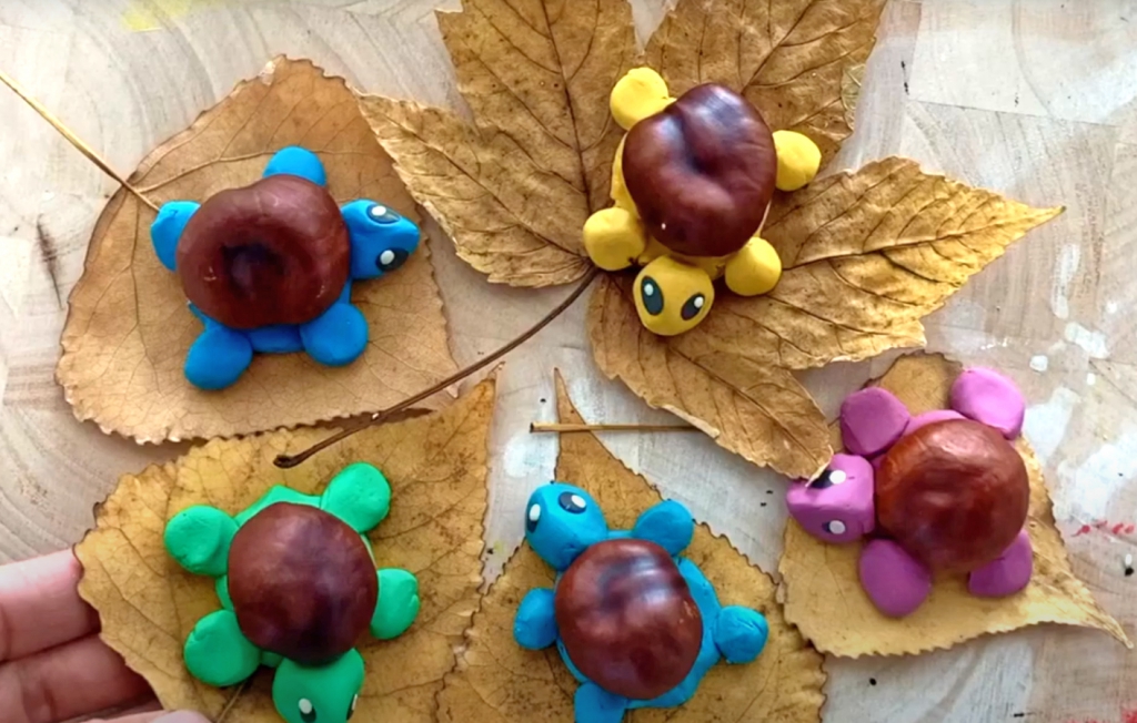 Első lépésben készítsétek el a teknős testét: színes gyurmából sodorjatok négy kisebb, egy közepes és egy nagyobb golyót. Lapítsátok szét őket és rakjátok össze a darabokat, előbbiből legyen a törzse, majd jöhet hozzá a feje és a négy lába. Végezetül tegyétek rá a gesztenyét, ez lesz a páncélja, és fekete, fehér gyurmából készítsétek el a szemét is. Gyártsatok belőle minél többet és indulhat is a játék!