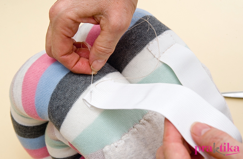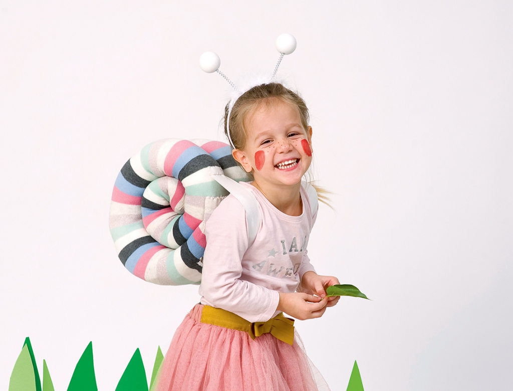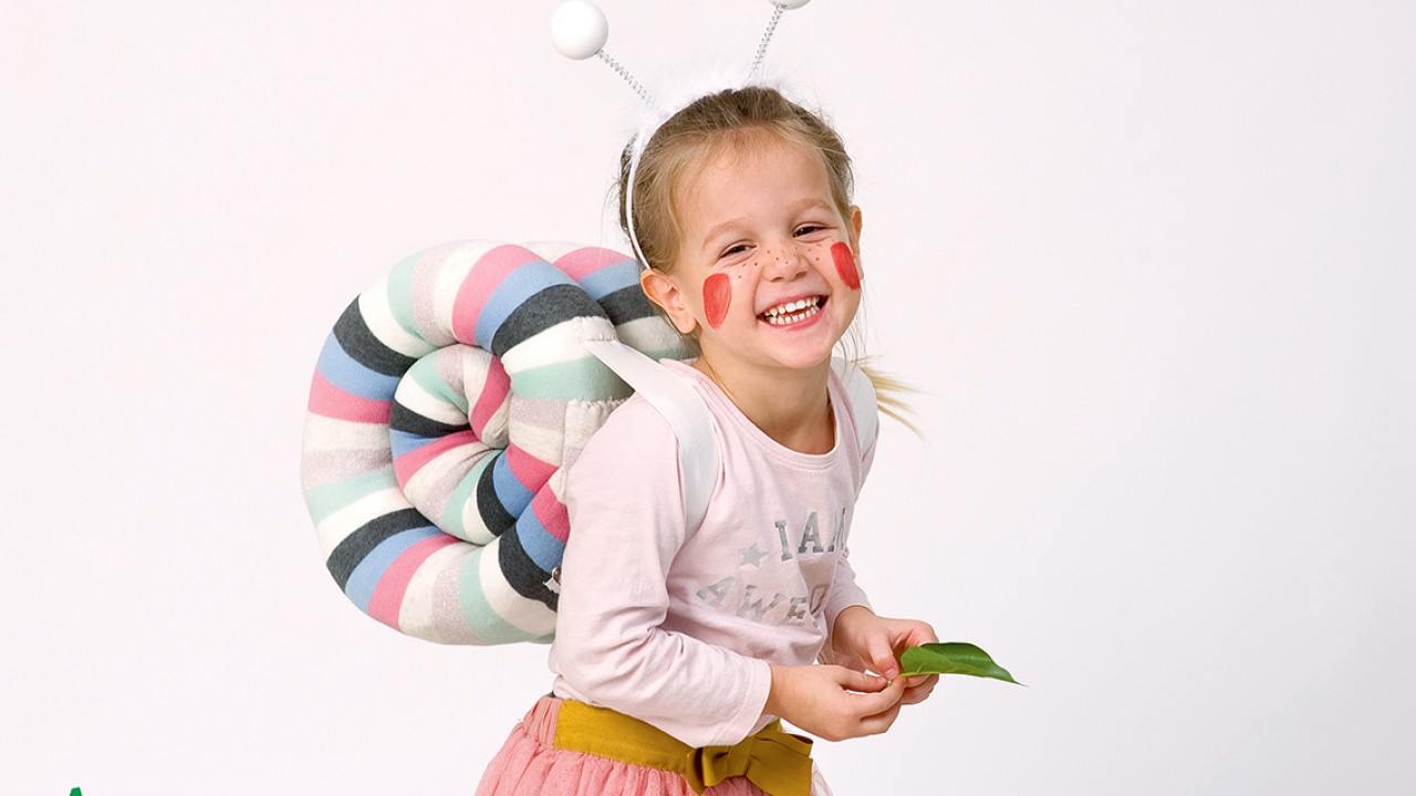 A nadrágrésznél lesimítva varrd le a derékvonalat, mert ez fekszik majd a gyerek hátára. Vágd ketté a gumiszalagot, és az egyik darab egyik végét hajtsd be, majd varrd fel a hátrész széléhez. A másik gumit öltsd a túloldal széléhez. Add fel a csigaházat, mint egy hátizsákot, és alul biztosítótűvel rögzítsd a házhoz a gumiszalagok végeit.