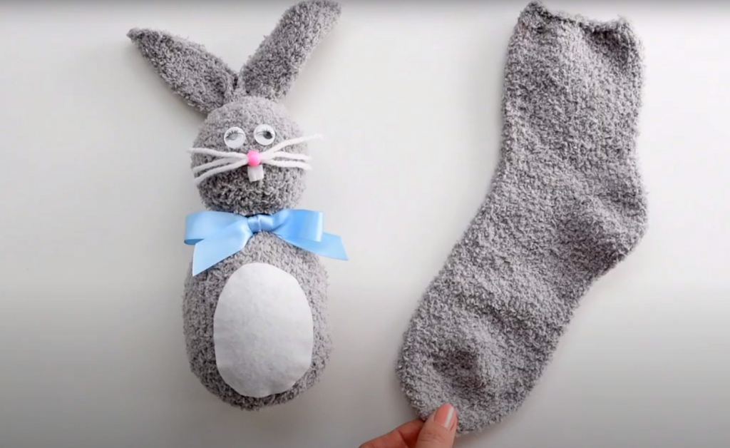 Fogj egy jó meleg zoknit, és tömd ki tömőanyaggal. Egy befőttes gumi segítségével alakítsd ki a pocakját és a fejét, illetve a felső részét, amiből majd a fülecskéi lesznek. Ragaszd rá a szemeit, az orrocskáját, a bajszát és a két fogacskáját. A hasára rögzíts egy fehér textildarabot, és illeszd hozzá a farkincáját: ez lehet egy kis pompon is. Végül ollóval formázd meg a füleit és a nyakára köss egy masnit.