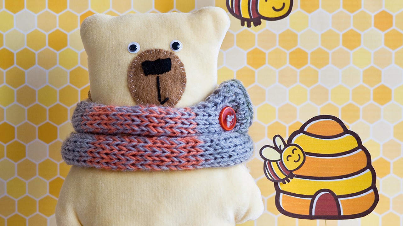 Úgy tűnik, nagyon fázik ez a maci, még sálat is kapott. Sebaj, a gyerkőcök úgyis folyamatosan ölelgetni fogják! Sárga vagy krémszínű plüssre lesz hozzá szükséged. Ha szeretnéd elkészíteni, kattints ide a leírásért és a fázisfotókért!