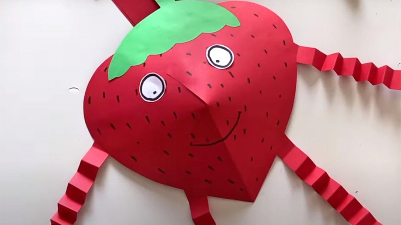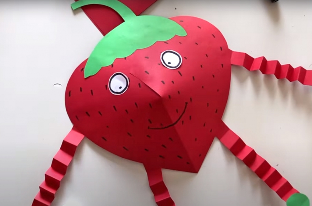 Az eperfigurák testéhez szükséged lesz egy nagyobb méretű piros színű papírra. Hajtsd ketté és vágj ki belőle egy szívet. Fekete filccel rajzold rá a kis magvakat, majd fent vágd be ollóval. Ragaszd össze a videón látható módon, így kész is van a teste. Zöld papírból vágd ki a szárát és ragaszd a piros részre. Ezután jöhetnek a szemek, majd pedig a karok, lábak: a piros papírból vágj ki hosszú cetliket, kissé hajtogasd össze őket és ragaszd a testre. Utolsó lépésben rajzold meg a száját és már kész is.