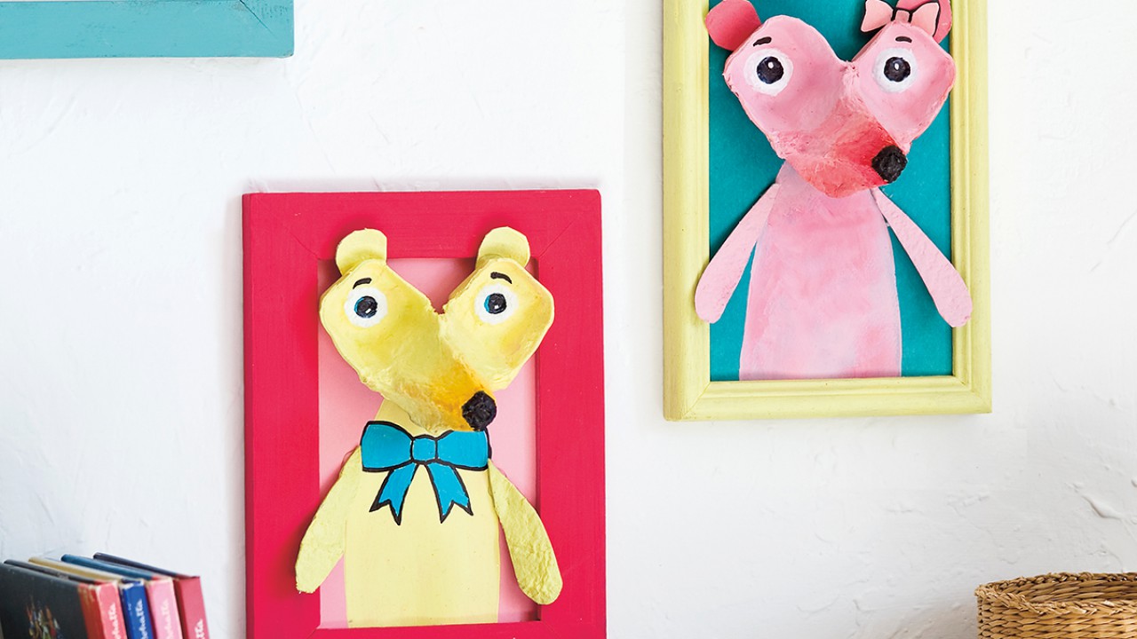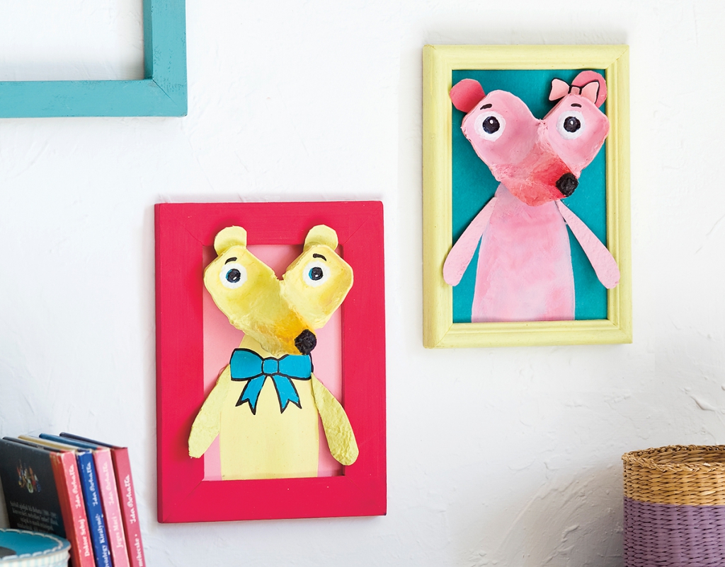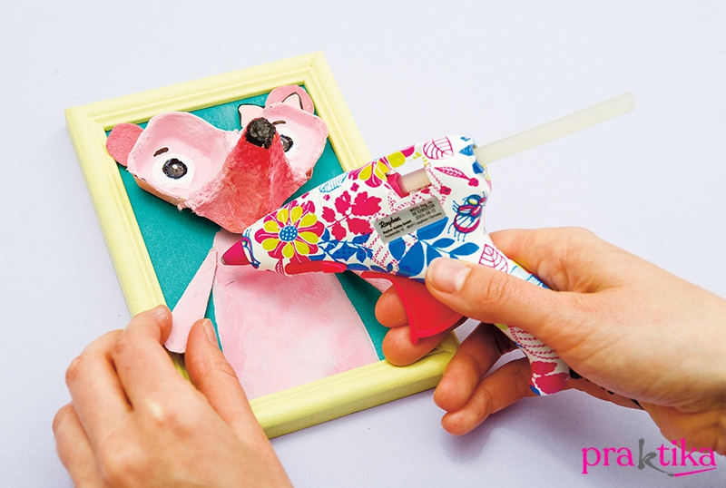 Száradás után az orra hegyét fesd feketére, a szemeknél először két fehér kört, majd két kisebb fekete kört fess. Ragaszd fel a két kicsi fület. Vágj egy akkora kartont, ami épp illik a keretedbe és melegragasztóval ragassz rá egy ovális darabot: ez lesz a test. Ragaszd fel a fejet és a karokat.
