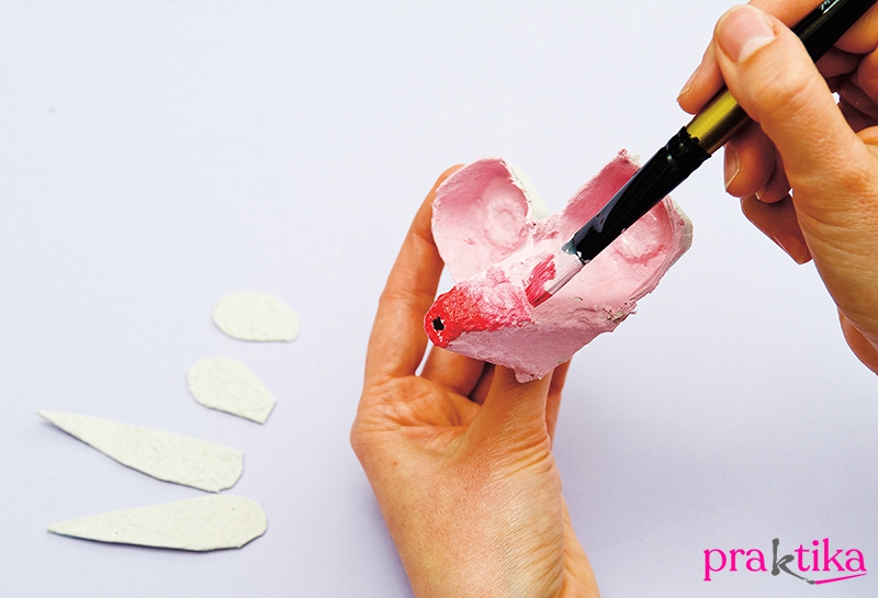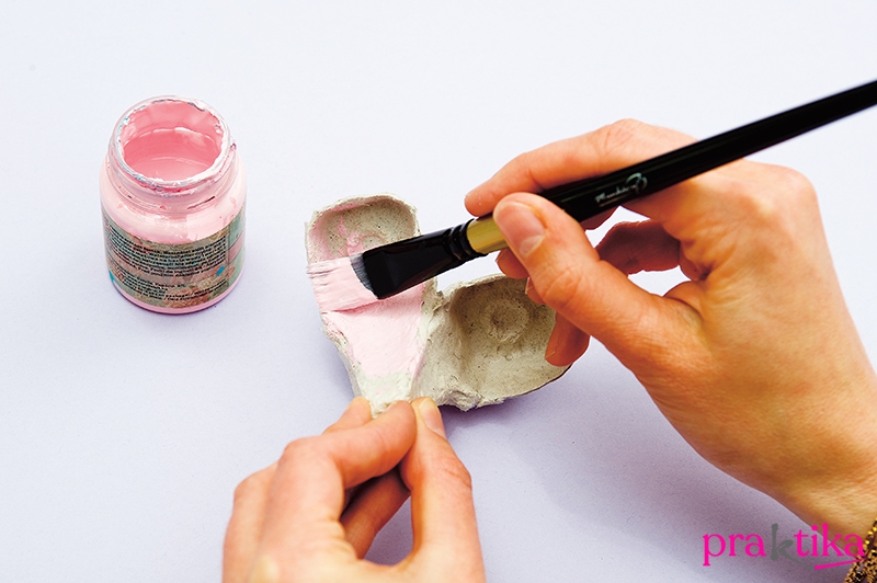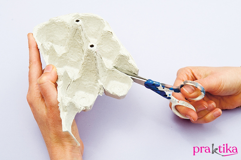 Vágj a tojástartóból a kép alapján egy arcnak való darabot. A maradék kartonból vágj füleket és karokat. Fesd le egy színnel a darabokat, majd az orránál sötétebb színnel fesd ki. Enyhén mosd össze a két szín találkozását.