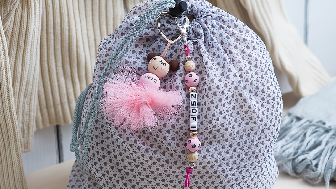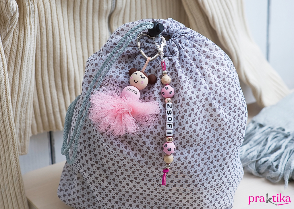 3. Várd meg, amíg megszárad a festék, majd a betűkockás jelölőhöz hasonlóan a bőrszíjat félbehajtva hurkold át a kulcskarikán, fűzd fel a fejet, a névvel ellátott golyót, a szoknyát, majd a sima rózsaszín golyót. Csomózd meg a szíjat.