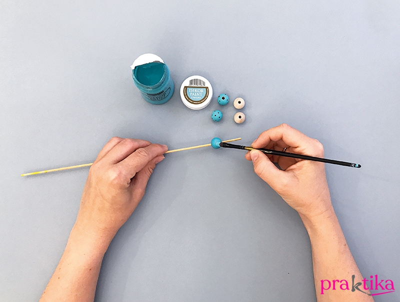 1. Fűzd fel a fagolyókat hurkapálcára, így könnyebben tudod őket festeni. Akrilfestékkel színezd őket kedved szerint: lehetnek egyszínűek, de készíthetsz különféle egyszerűbb mintásakat is kedved szerint, pl. pöttyöset, csíkosat vagy leopárd mintásat.