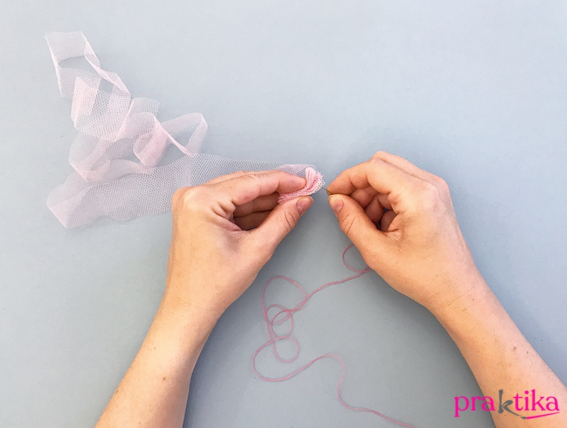 2. A középső és az alsó nagy golyót is fesd le rózsaszínre, majd a középsőre S-es méretű, fekete alkoholos filctollal írd rá a gyermek nevét. A rózsaszín tüllcsíkot fél centinként fogd össze legyezőszerűen, majd az egyik végénél öltsd össze, ez lesz a szoknyája.
