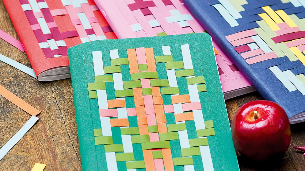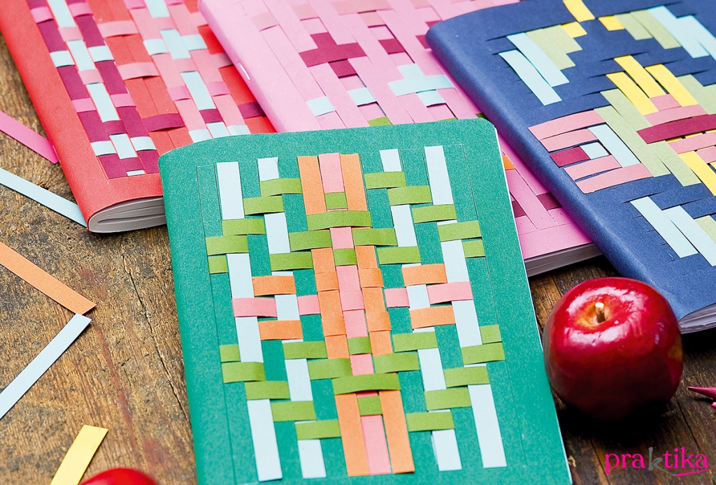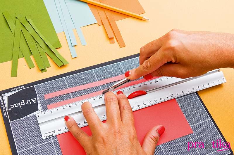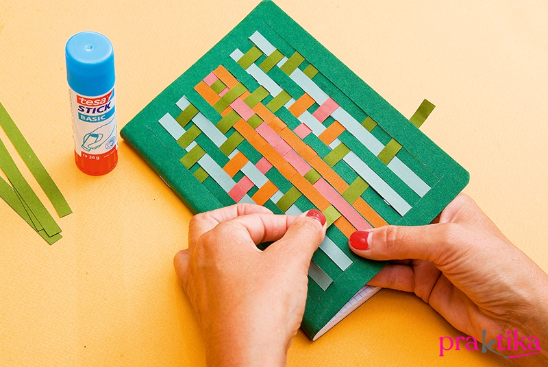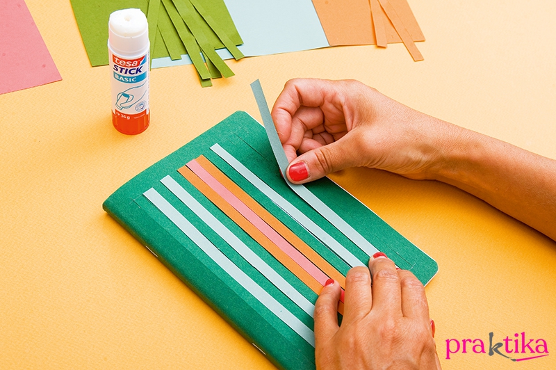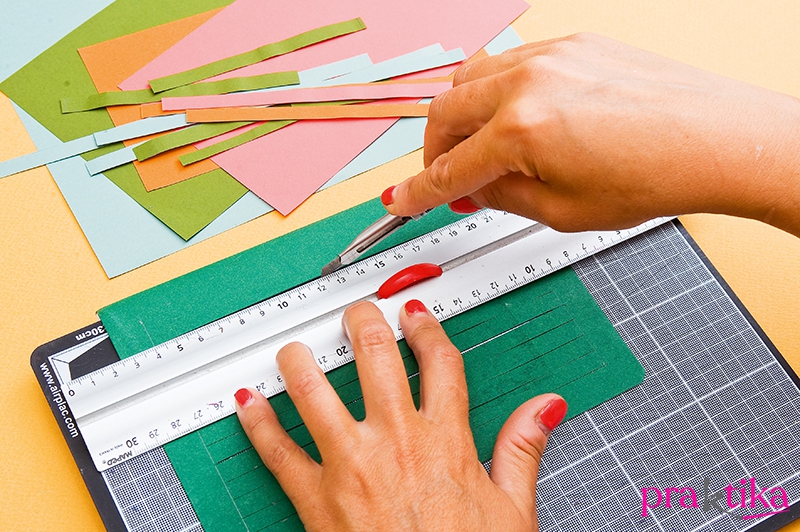 2. A vékony, színes kartonokat is vágd fel ugyanilyen széles csíkokra. Használd fel az otthon talált maradék papírokat, párosítsd bátran a színeket! A borítón lévő „láncfonalakra” ragassz színes csíkokat, így gazdagabb lesz a minta.