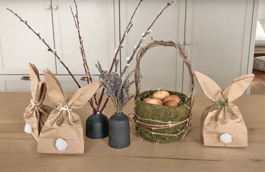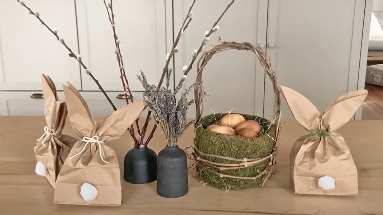 Ezekhez a nyuszis tárolókhoz egy-egy papírzacskóra lesz szükséged. Hajtsd ketté, majd a felső részébe vágj egy ívet a videón látható módon. Ha jól csináltad, visszahajtva láthatóvá válnak a nyúl fülei. Rejtsd el a cukorkákat a belsejébe, majd óvatosan nyomd össze a zacskót a fülecskék alatt és egy szalaggal vagy madzaggal kösd össze. Végül melegragasztóval ragassz az oldalára egy pompont.