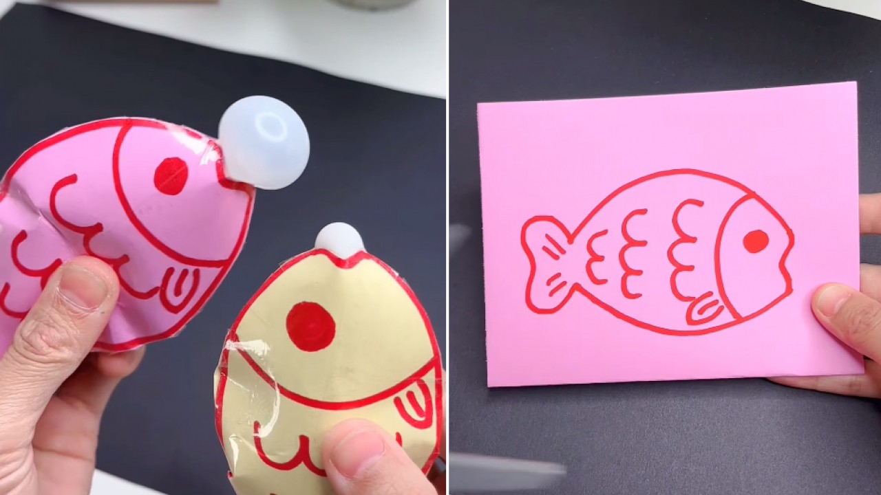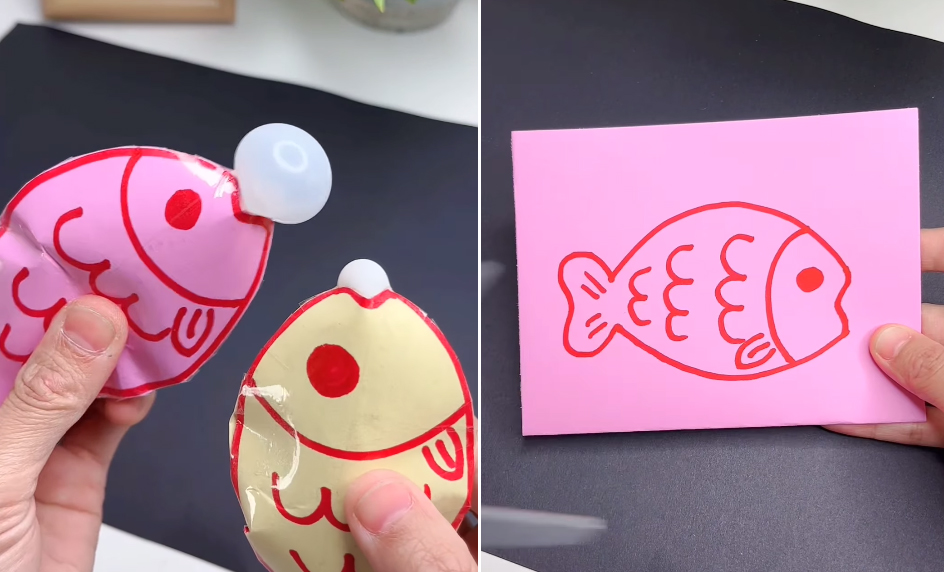 Színes papírlapra rajzolj fel egy halacska formát, majd vágd ki kétszer. Rajzold fel rá a pikkelyeket, uszonyokat. Ezután vond be celluxszal az egyik halacskát, a lelógó fél centis részt pedig vagdosd be (a szájánál hagyj ki egy kis részt. A lufiba fújj egy kevés levegőt, kösd össze a szájánál, majd celluxszal ezt is tekerd körbe. Tedd mellé a halacska két oldalát és a cellux segítségével ragaszd össze a kettőt. Ha jól dolgoztál, amikor összenyomod finoman a halacskát, buborékot fog fújni.
