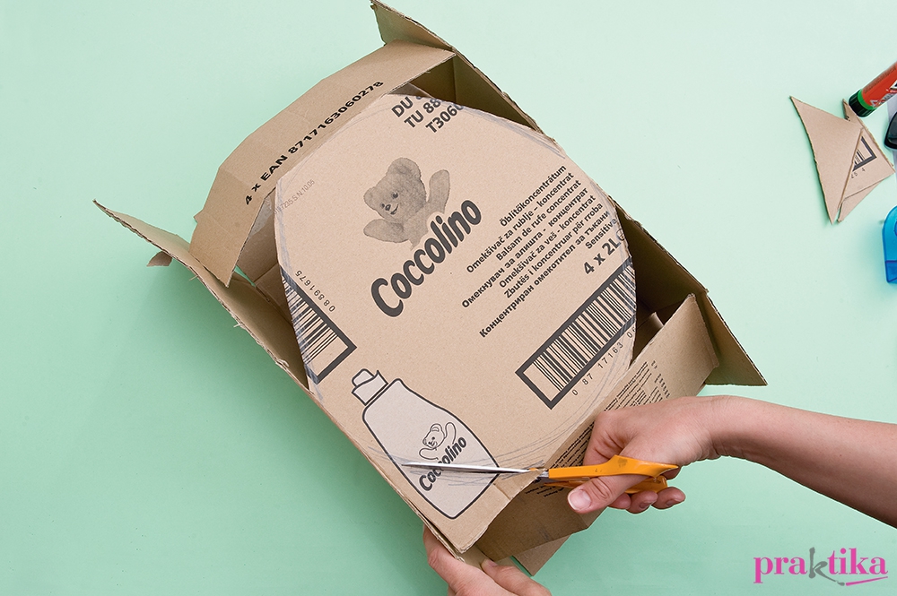 Szabad kézzel rajzolj tojásformát a dobozkartonra, majd vágd ki. Két egyforma darab kell, ez lesz a piñata eleje és hátulja. Vágj le egy széles sávot a kartonból az oldalának.
