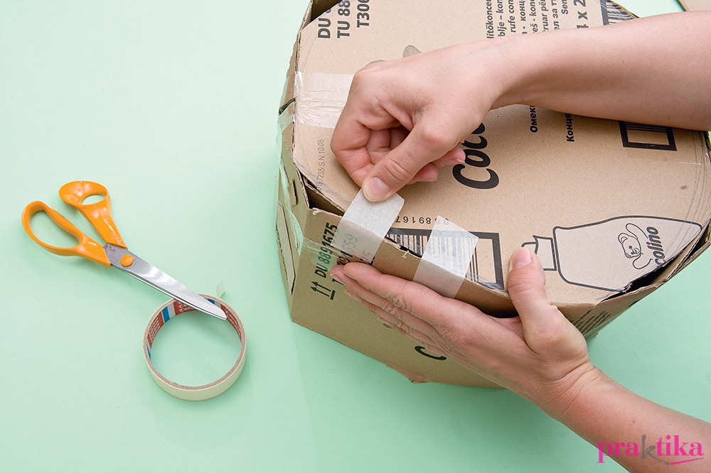 Vastag cellux vagy maszkolószalag segítségével ragaszd össze a kartondarabokat, és közben tedd bele a finomságokat, vagy hagyj a egy nyitható részt a doboz tetején. Ha szeretnéd, hogy a gyerekeknek jól meg kelljen dolgozniuk a benne lévő édességért, akkor sűrűbben tedd a ragasztócsíkokat.