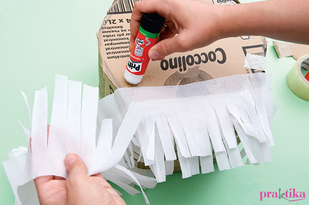 • Vágj le kb. 10 cm magas csíkokat a krepp-papírból, és vagdosd be 6-7 cm-re, hogy rojtos legyen. Stiftes papírragasztó segítségével kezdd el beborítani a piñatat a fehér kreppel. Alulról haladj felfelé.