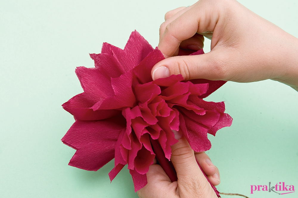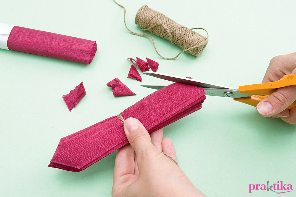 • Készítsd el a kreppvirágokat is: vágj le 8 db téglalapot (kb. A4-es méretet) a krepp-papírból, és legyezőszerűen hajtosagd be. A közepénél kösd meg cérnéval. A végeit vágd le hegyesre vagy kerekre, terítsd szét és rétegenként húzd be a papírt a virág közepe felé. Ha kész, melegragasztóval rögzítsd a szarv mellett.