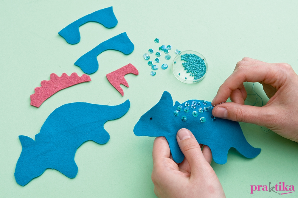 Vágd ki az állat részeit. A testét varrd ki elszórtan flitterrel: fűzd a tűt alulról a filcbe, húzz rá egy flittert és egy
