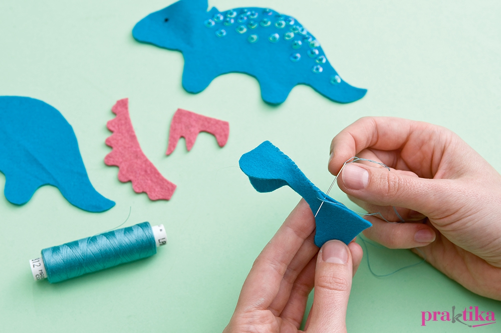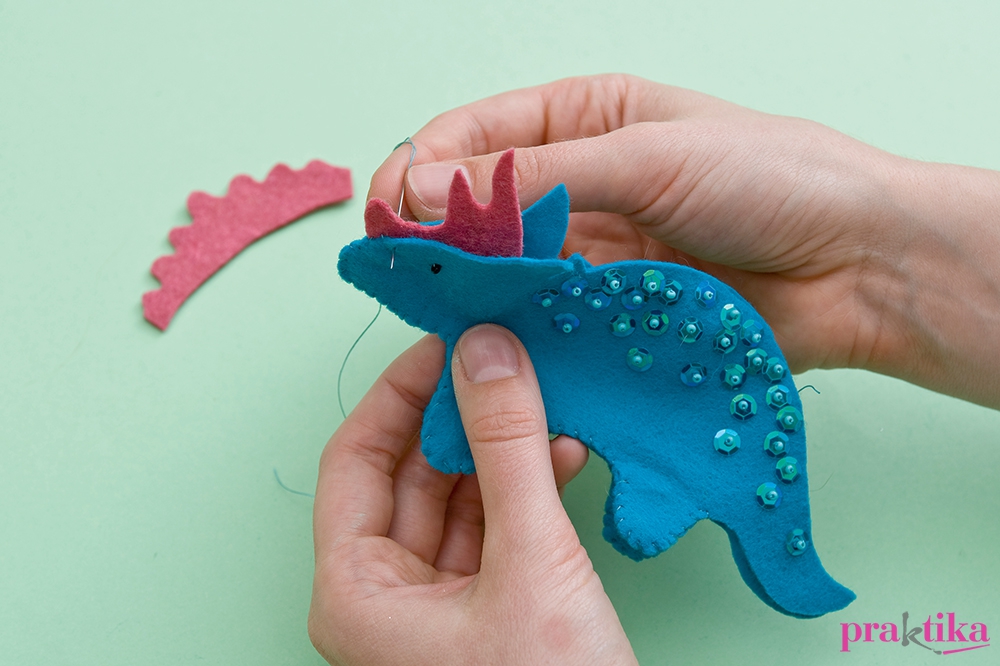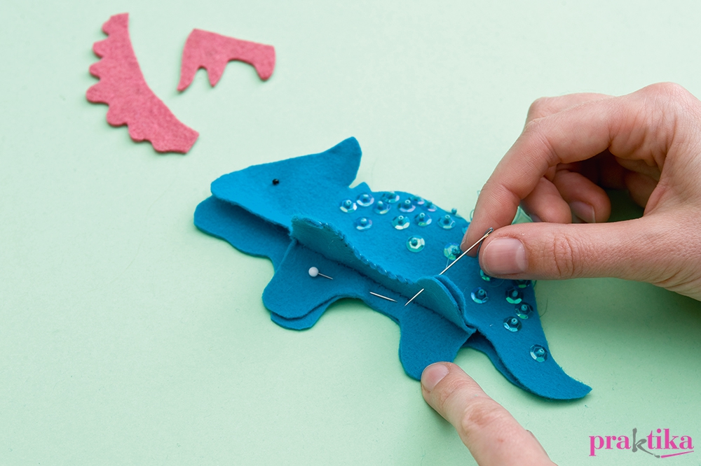 szem gyöngyöt, majd a flitter lyukán át bújtasd vissza alulra. A szemek helyére varrj egy-egy fekete kásagyöngyöt. Kézzel öltsd össze a két hasi részt a felső, íves oldaluk mentén. Gombostűzd be a darabot a két testfél közé, majd varrd végig apró pelenkaöltésekkel. A tüskéket illeszd be a megfelelő helyre, és azt is öltsd át, amikor a hát ívét varrod. Mielőtt teljesen végigérnél, tömd ki keményre a figurát.