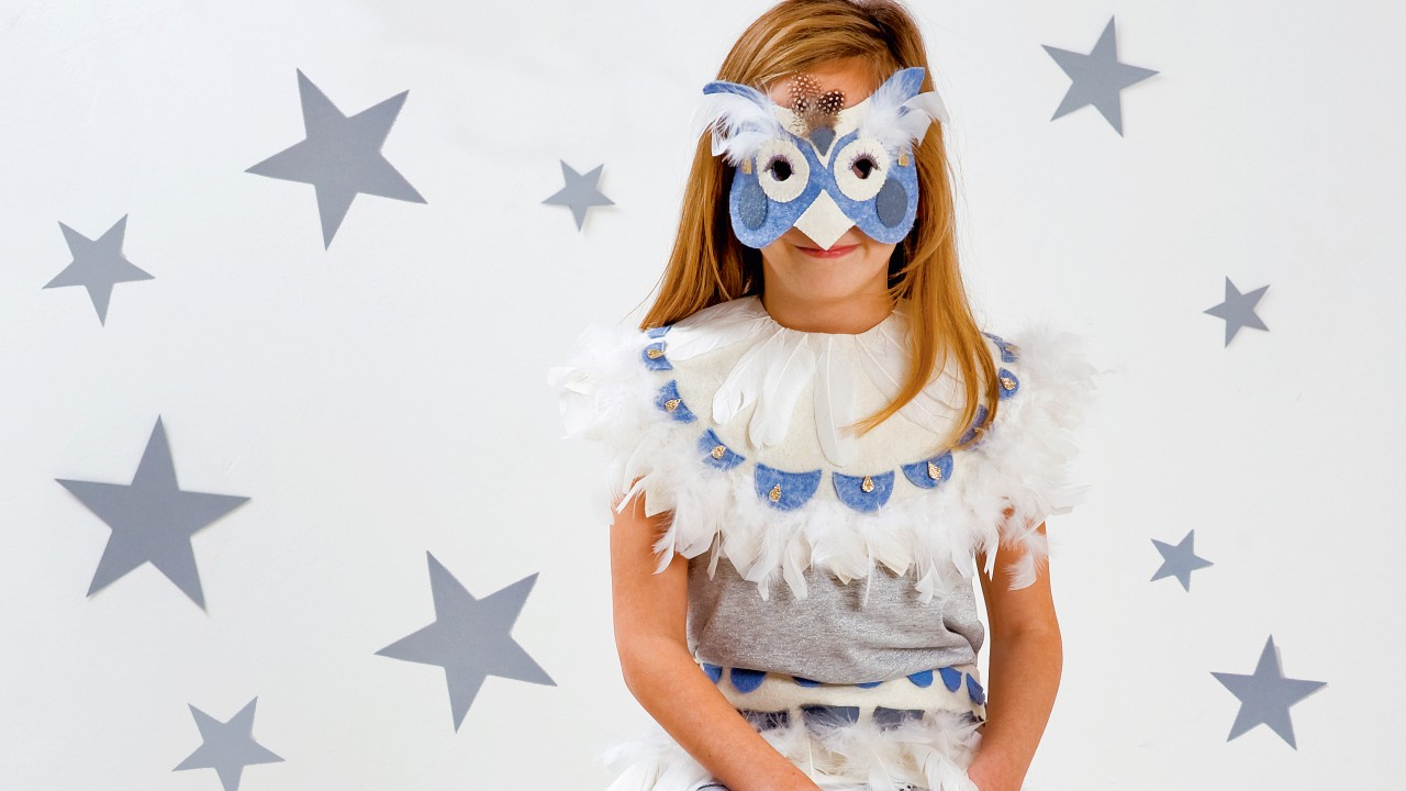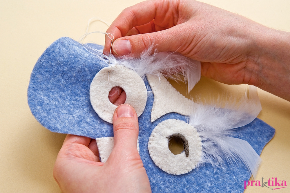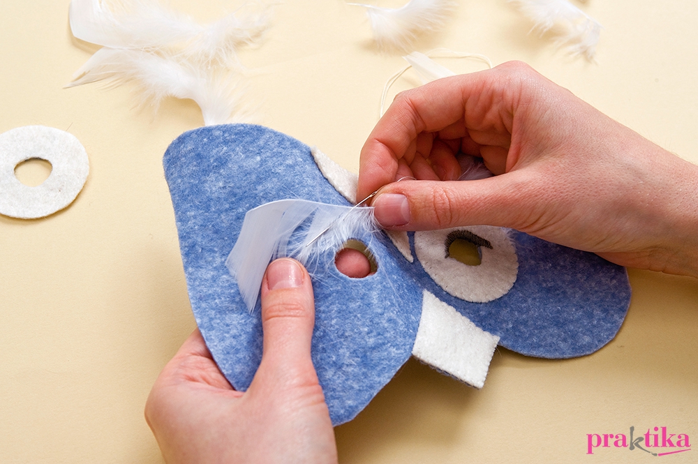 A maszkra, a szemnyílások fölé kézzel öltögesd fel a tollakat. Érdemes átszúrni a tollak szárát is, nehogy kicsússzanak az öltésből. A tollakra helyezd rá a szem körüli karikákat, és tisztázó öltésekkel varrd körbe. Ugyanígy varrd fel a csőrt, a pofit és a homlokon lévő elemet is. A homlokrészre ölts fel még 3 db tollat. A szemeket tovább díszítheted hímzéssel. A szemhéjat és a szempillákat laposöltéssel készítsd el. A szemek mellé ragassz kis dekorgumi szívecskéket, végül erősítsd fel a kalapgumit a maszk két szélére.