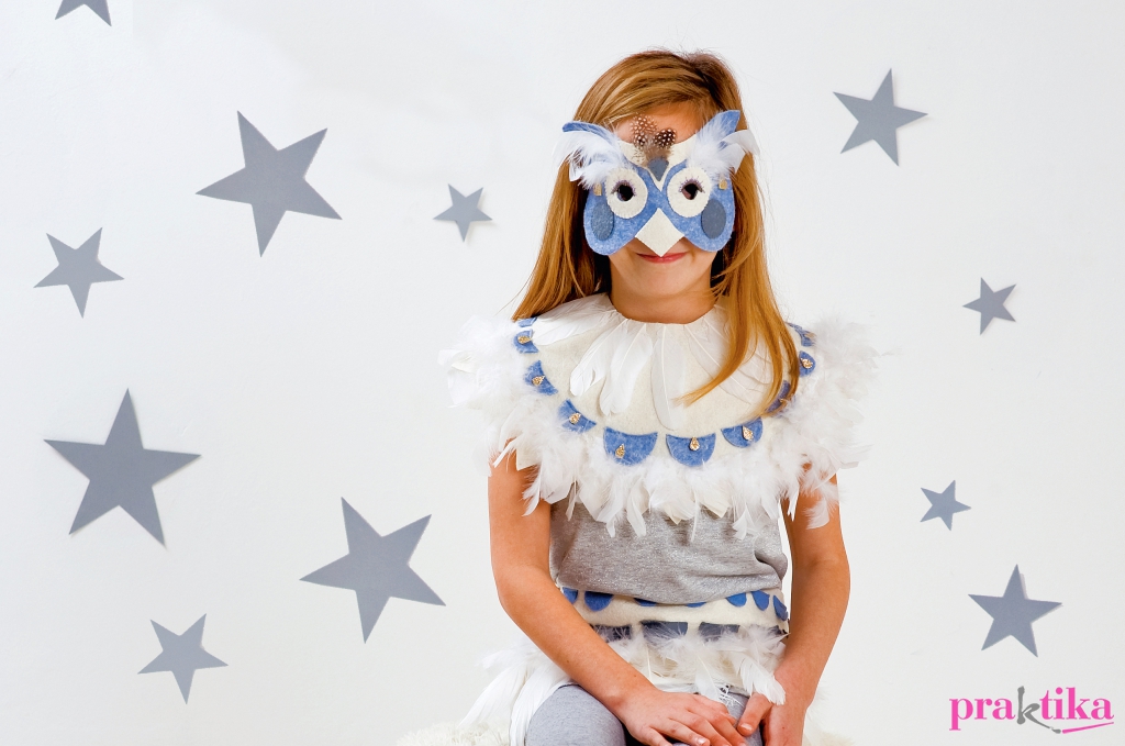 Szabd ki a maszkot és a gallért a megfelelő színű filcekből. A bokapántnak úgy szabd ki a téglalapokat, hogy a boka körméretére hagyj rá néhány cm-t, hogy elég laza legyen és a patentnek is legyen helye. Az egyik hosszabb oldalukat cikcakkold végig. A gallér, a szoknya és a boka elemeire varrd fel géppel a puhább, fehér tollakat. Hajtsd vissza a tollak felső részét, és így is varrd végig azokat. A tollak fölé a szürke filcekből szabj pikkely alakú darabokat, és azokat is öltsd rá a filcre. Varrj patentot a kész darabokra.