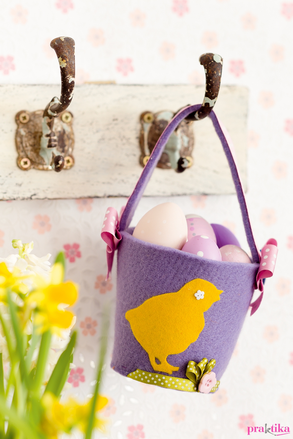 A rózsaszín pöttyös szalag közepére ragassz fel egy 25x3 cm-es lila filcsíkot fülnek, majd az anyag éleit ragaszd a kosár peremére. A szalagvégekből hajts masnit, és varrj rájuk egy-egy gombot. A zöld szalag közepéből készíts hurkokat, és ragaszd a kosárkára, ölts rá egy gombot dísznek. A csibének ragassz gombszemecskét.