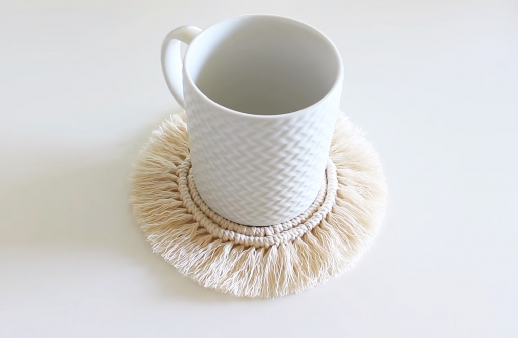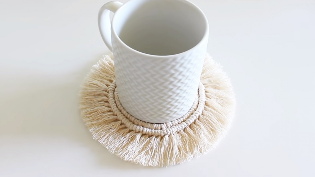 A poháralátéthez vágj le egy 12 centiméter hosszú zsinórt, ebből készíts egy hurkot. Készíts elő öt darab nagyjából 76 centis zsinórt, ezekből kell csomókat készítened a hurok köré. Ha rögzítetted mind az ötöt, húzd össze a hurkot és máris kialakult a poháralátét közepe.