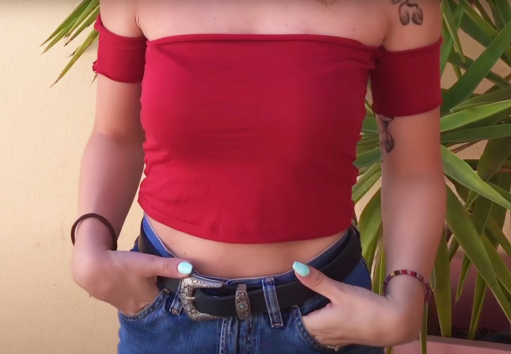 Fogj egy régi, egyszínű pólót, majd vágj le belőle egy vastagabb csíkot a hónaljvonal alatt. Az alsó, bővebb részét varrd szűkebbre úgy, hogy felvéve testhez simuljon. Ezután a korábban levágott csíkból készítsd el a ruha ujját: varrd akkorára, hogy passzoljon a karod vastagságához. A két darabot végül rögzítsd a top törzsrészéhez.