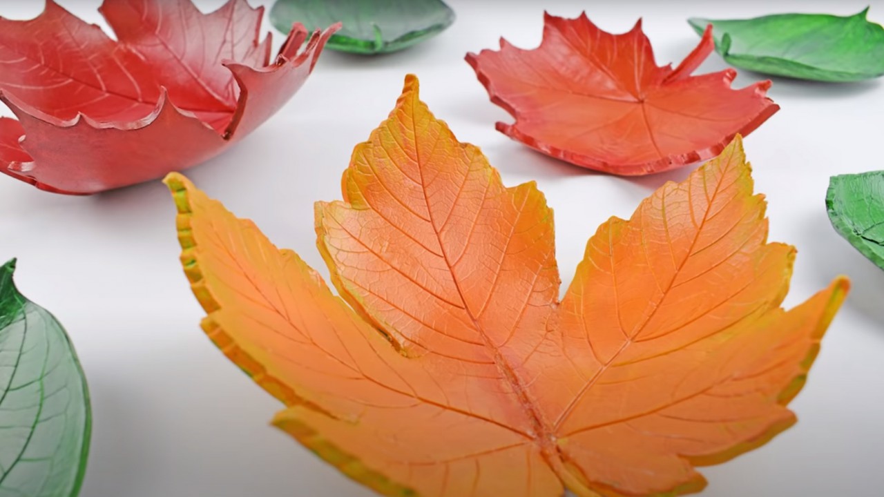 A gyurmát egy nyújtófa segítségével nyújtsd ki. Próbálj meg gyorsan dolgozni, mert hamar megszárad az anyag és utána nehéz vele dolgozni. Ha elég vékony lett, tegyél rá egy nagyobb falevelet. Nagyon szép eredményt érhetsz egy juharlevéllel, de természetesen mással is kísérletezhetsz. Egy sniccerrel vágd körbe és rajzold be az erezetét. Folpackkal bélelj ki egy tálat és tedd bele a gyurmalevelet. Hagyd teljesen megszáradni, majd óvatosan vedd ki. Ezután már csak a festés hiányzik: remekül mutat ezüst és aranyszínben, de akár az ősz egyéb árnyalatait is használhatod.